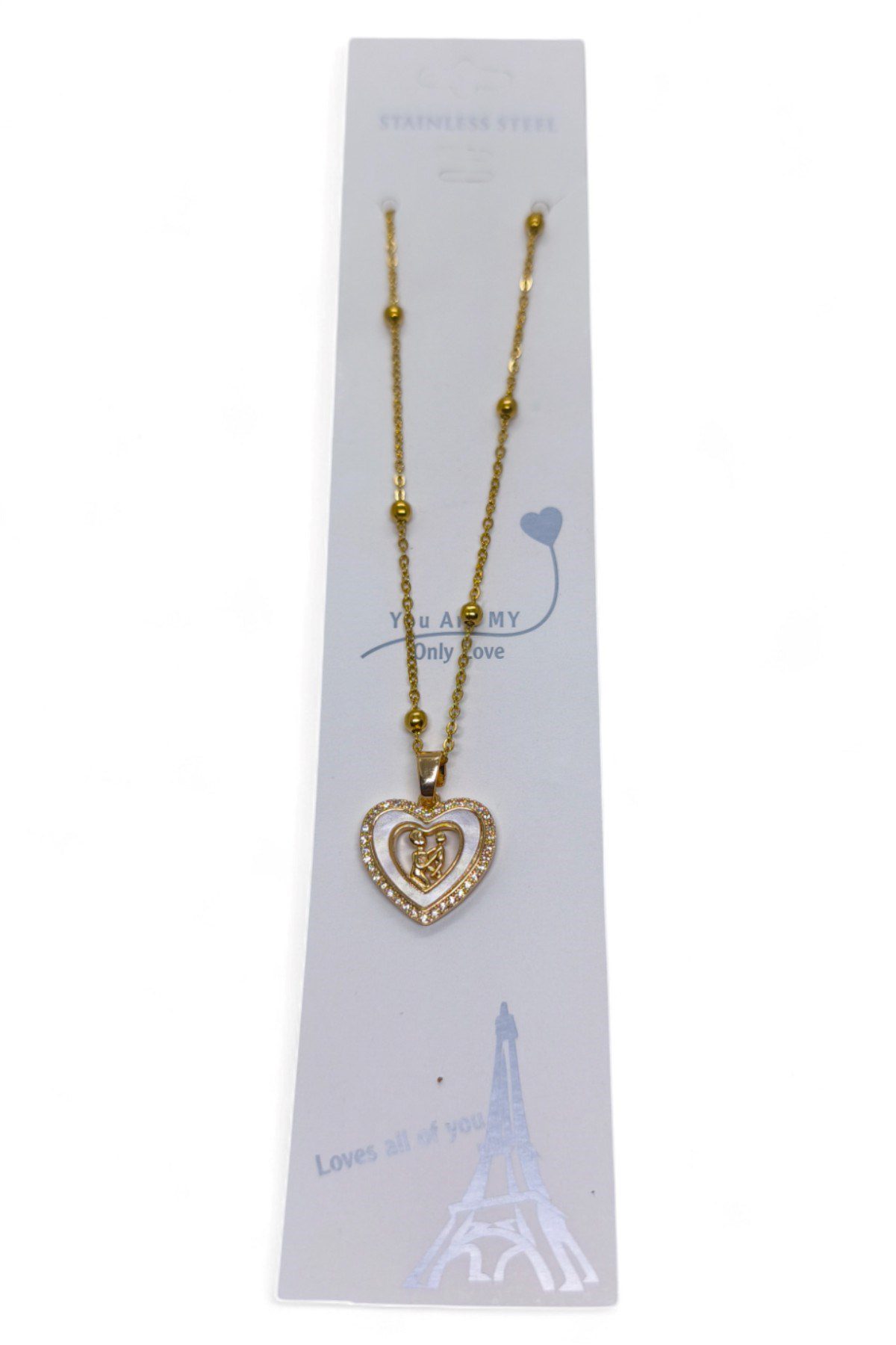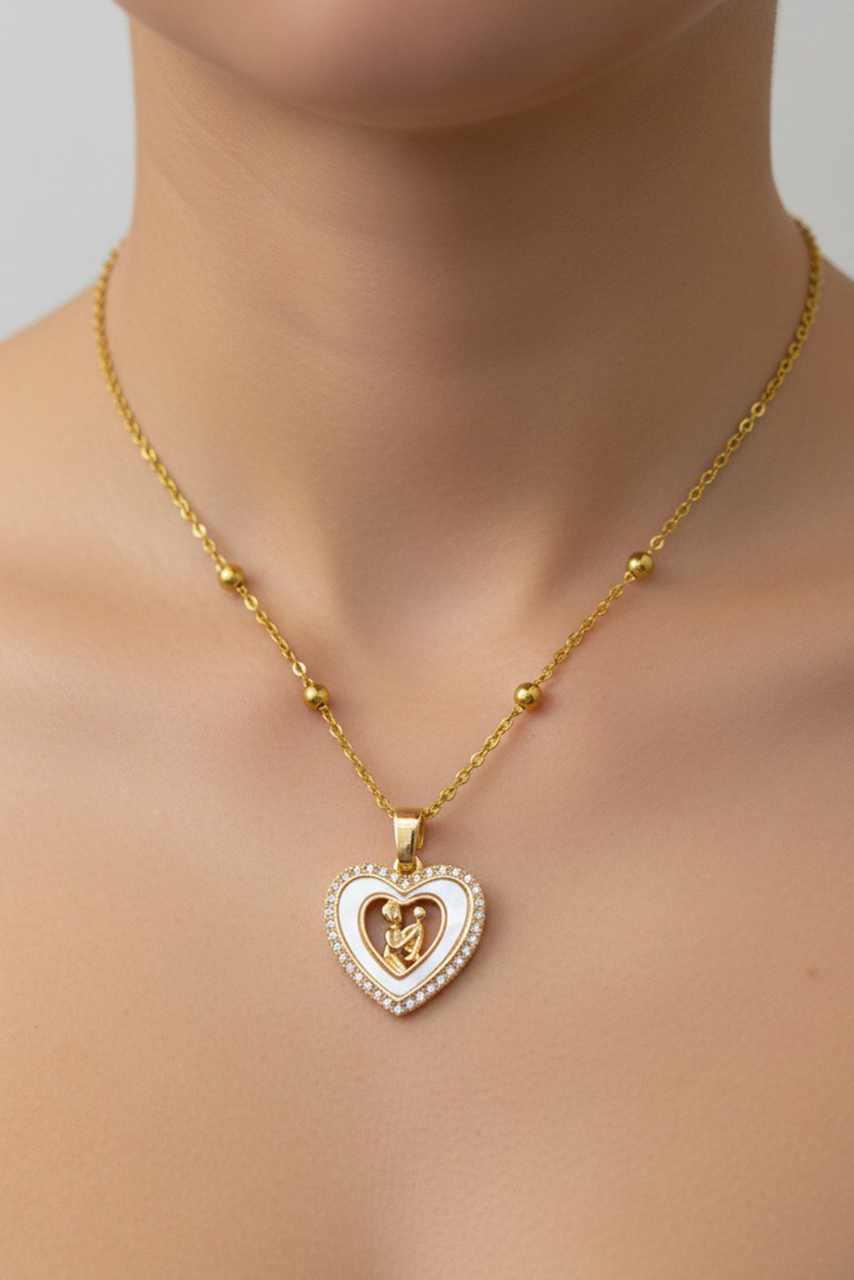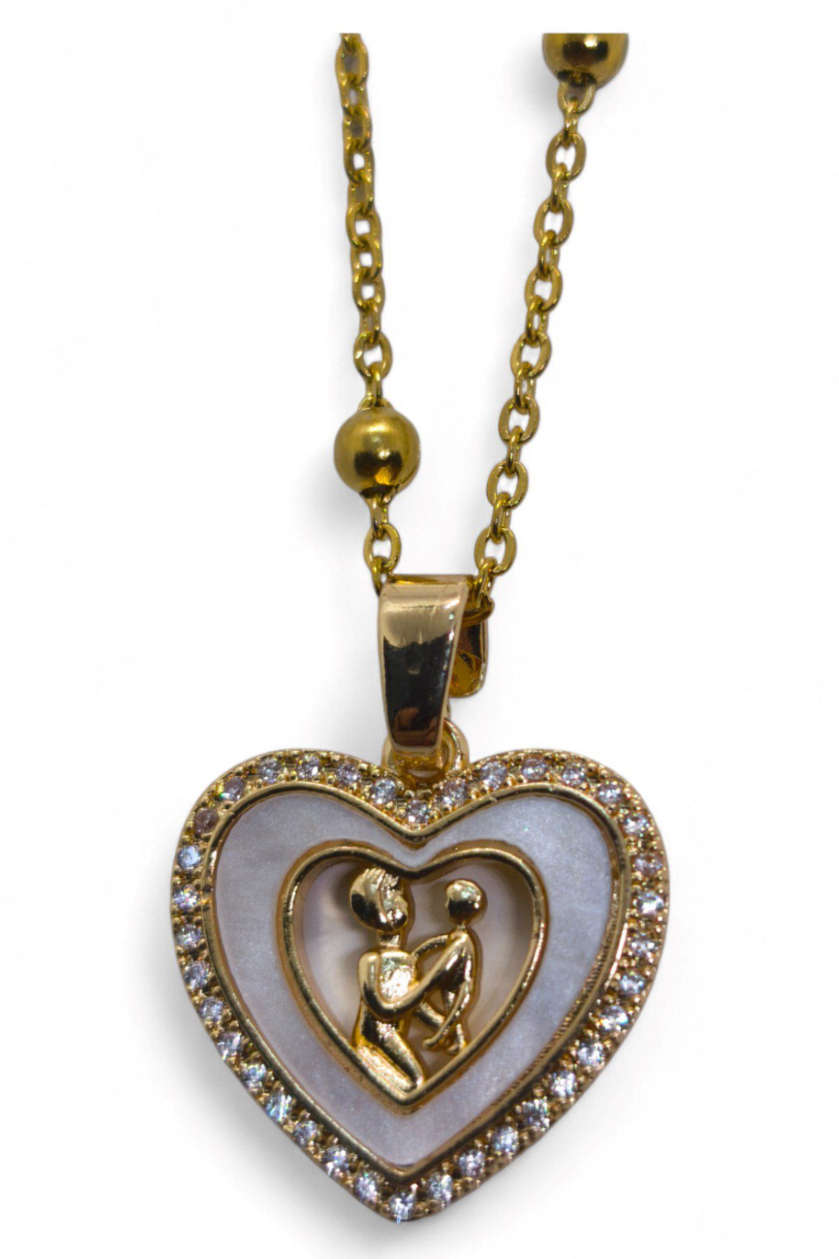 Toptan Altın Renk Beyaz Mineli Anne Kız Kalp Model Top Zincir Çelik Kolye- 3707
