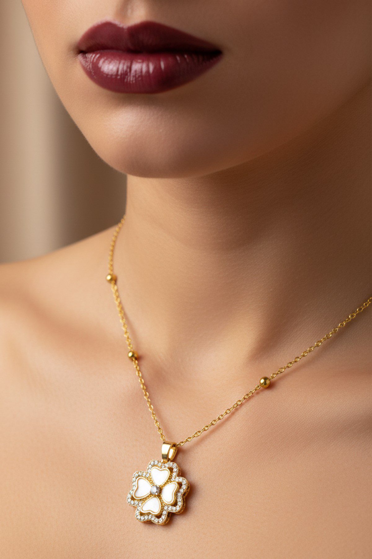 Toptan Altın Renk Beyaz Sedef Van Cleef Yonca Model Top Zincir Çelik Kolye- 3726