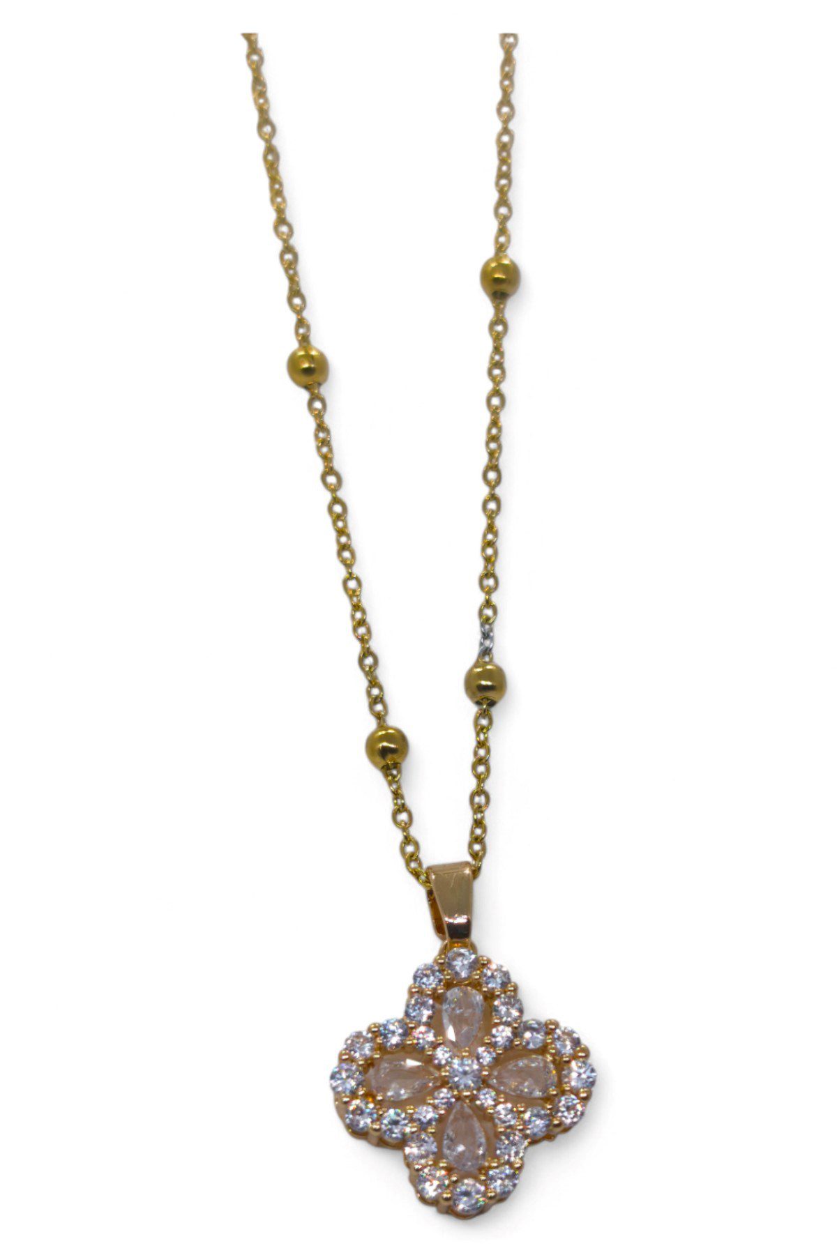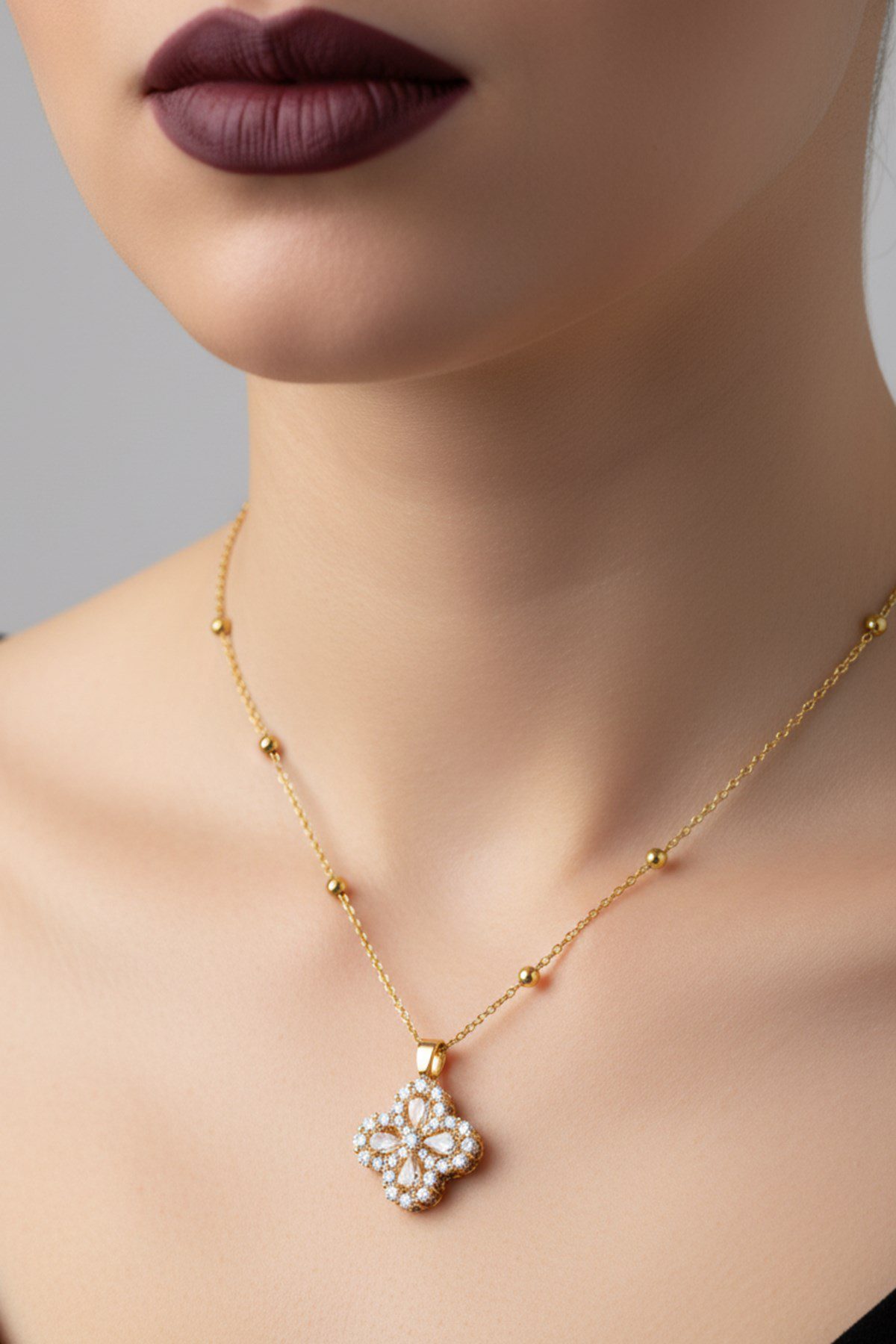Toptan Altın Renk Beyaz Taş Van Cleff Yonca Damla Taşlı Model Top Zincir Çelik Kolye- 3717