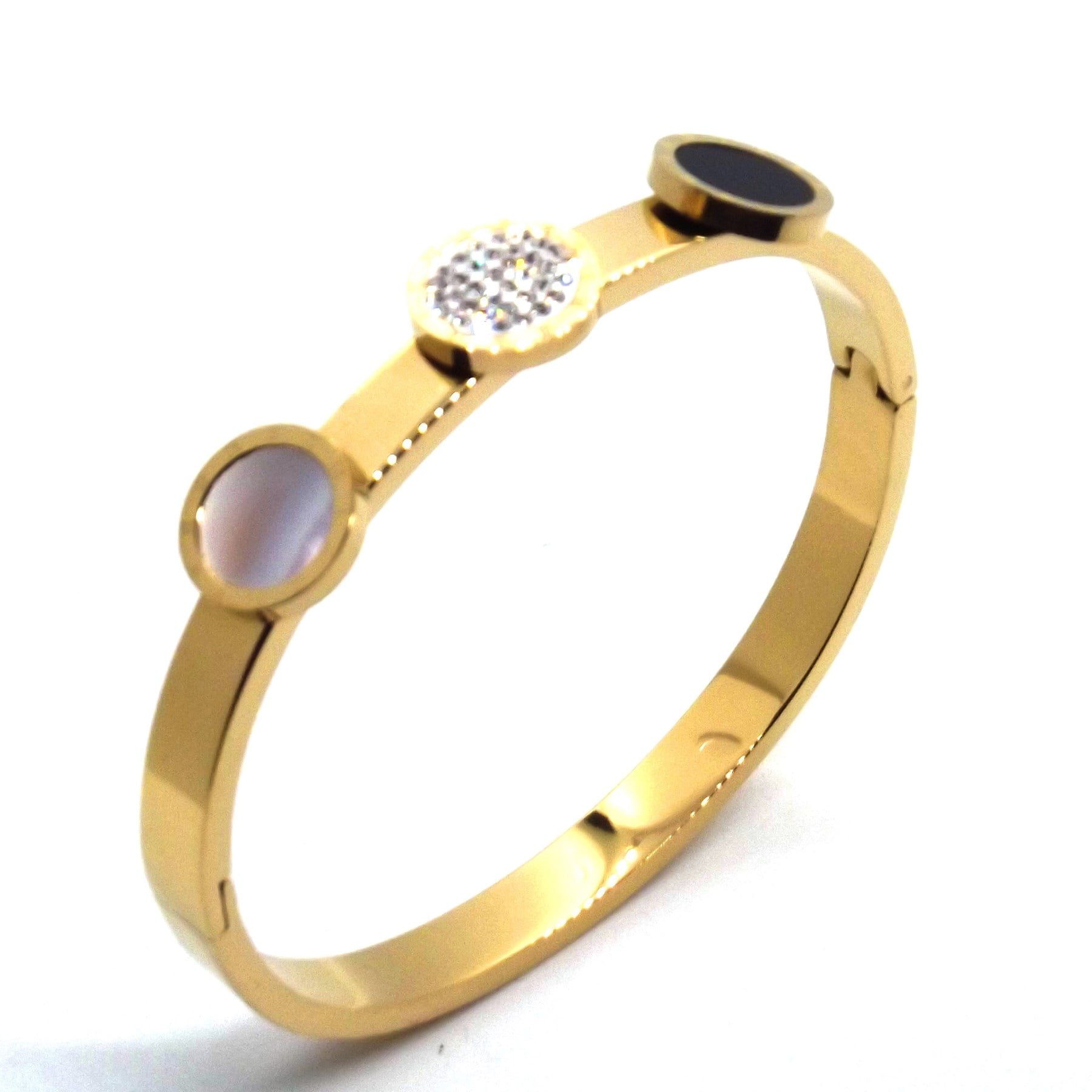 Toptan Altın Renk Çelik 3lü Yuvarlak Roma Detaylı Çok Taşlı Kelepçe Bileklik 672