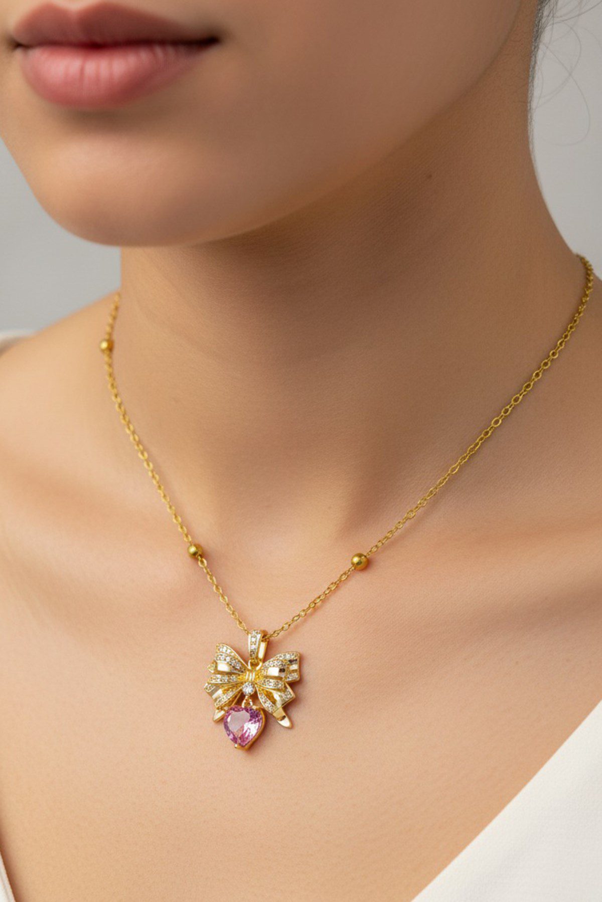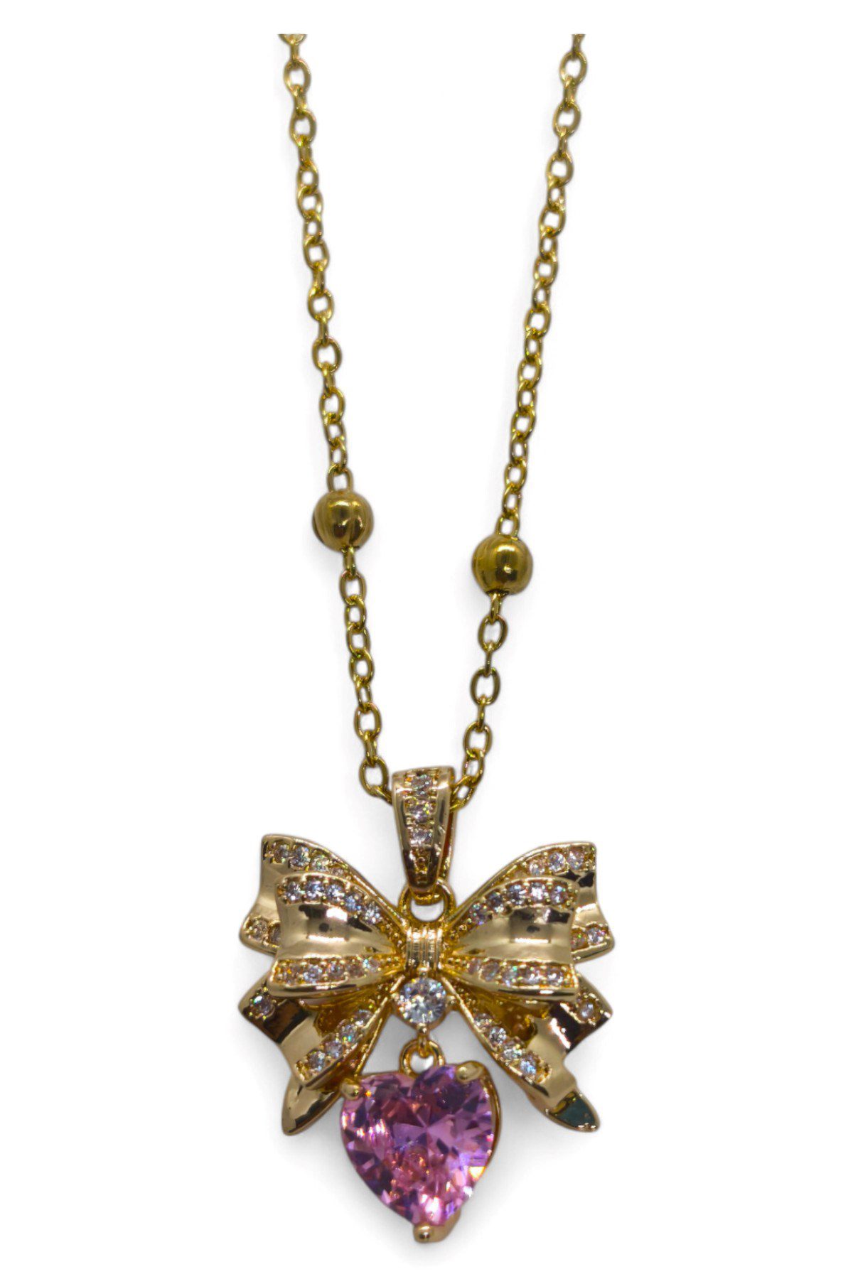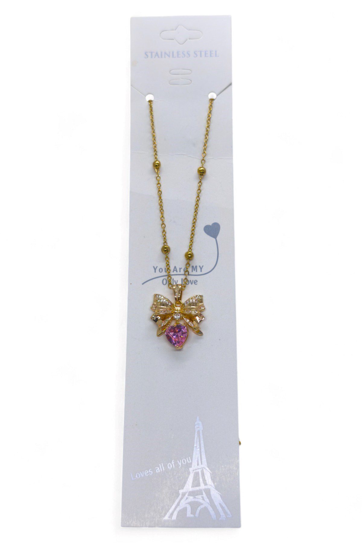 Toptan Altın Renk Fiyonk Pembe Kalp Model Top Zincir Çelik Kolye- 3704