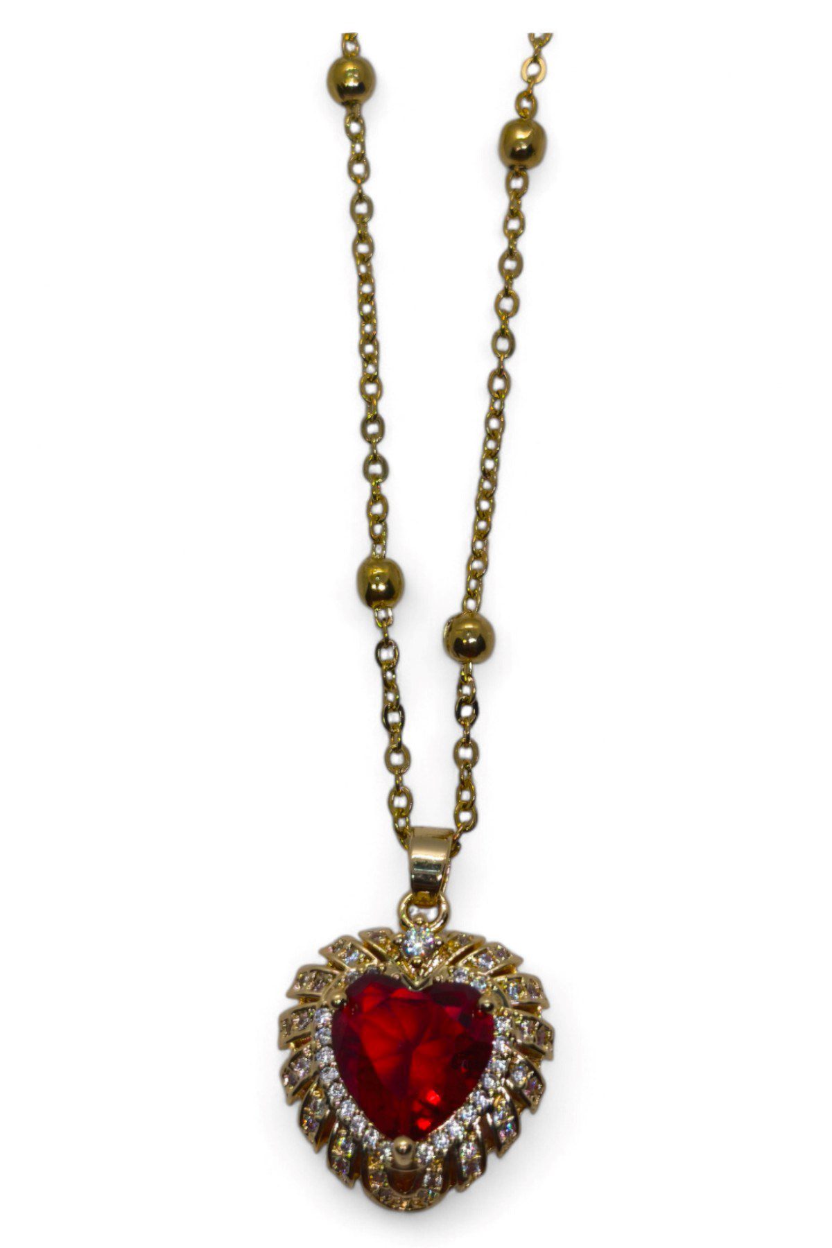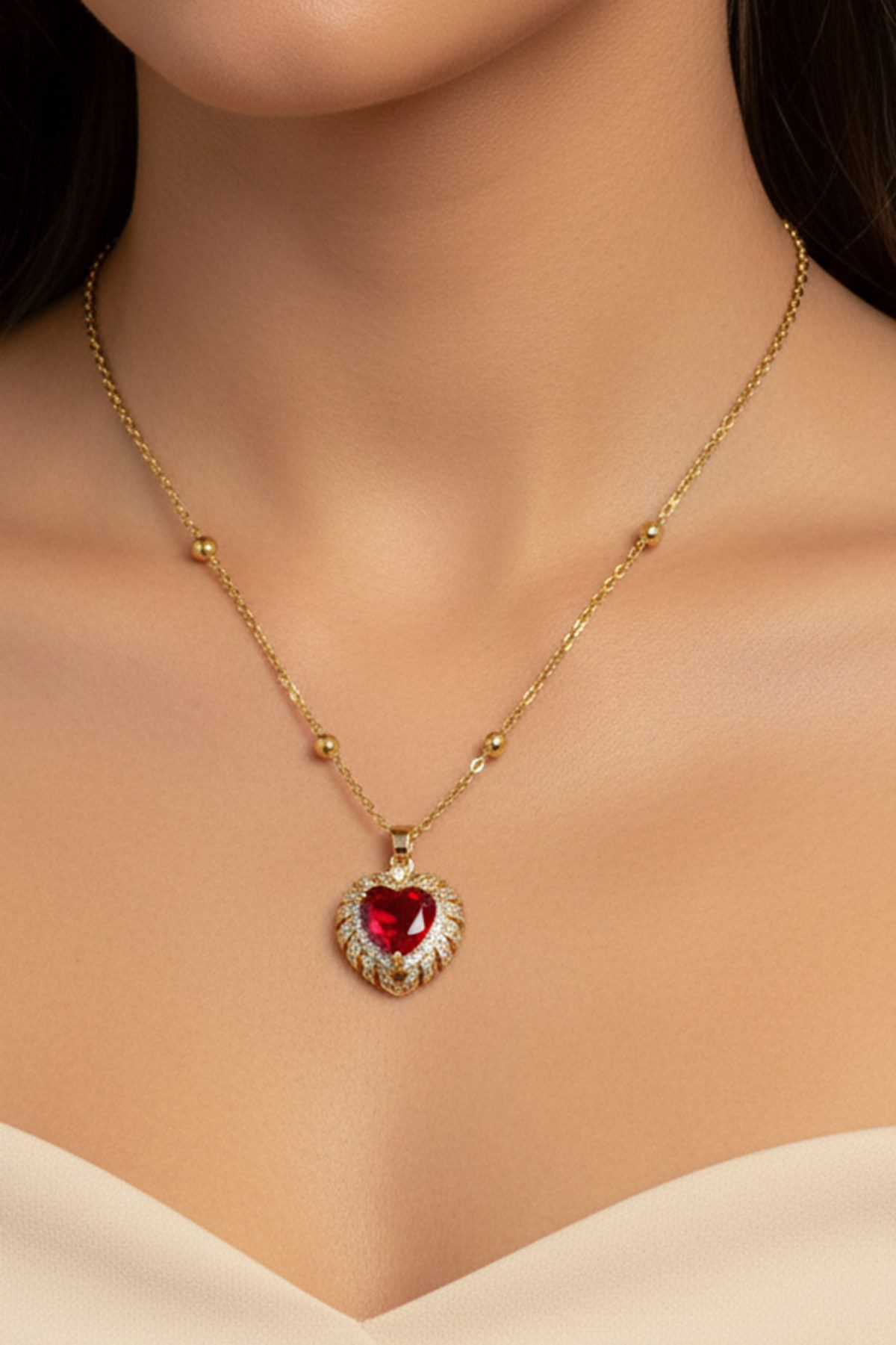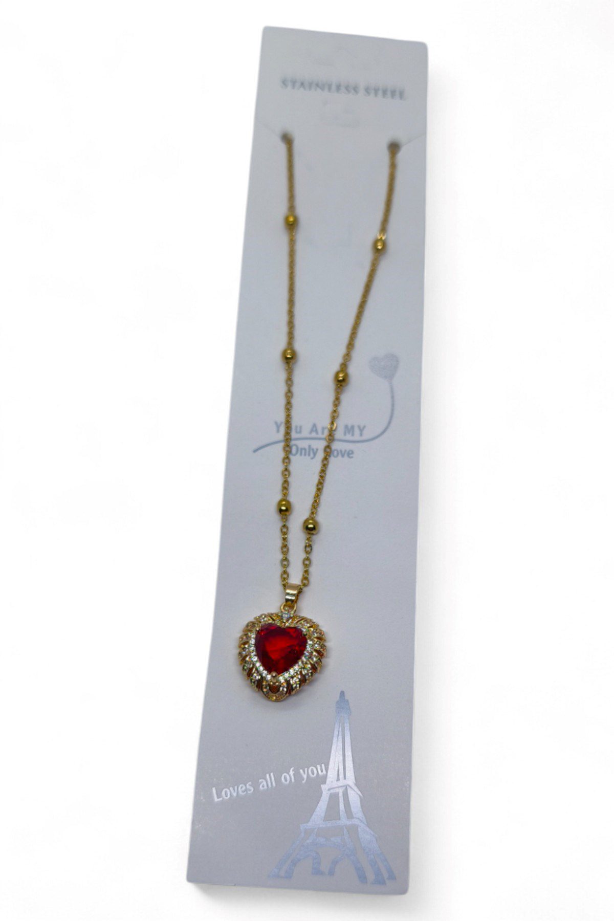 Toptan Altın Renk Kırmızı Kalp Model Top Zincir Çelik Kolye – 3685