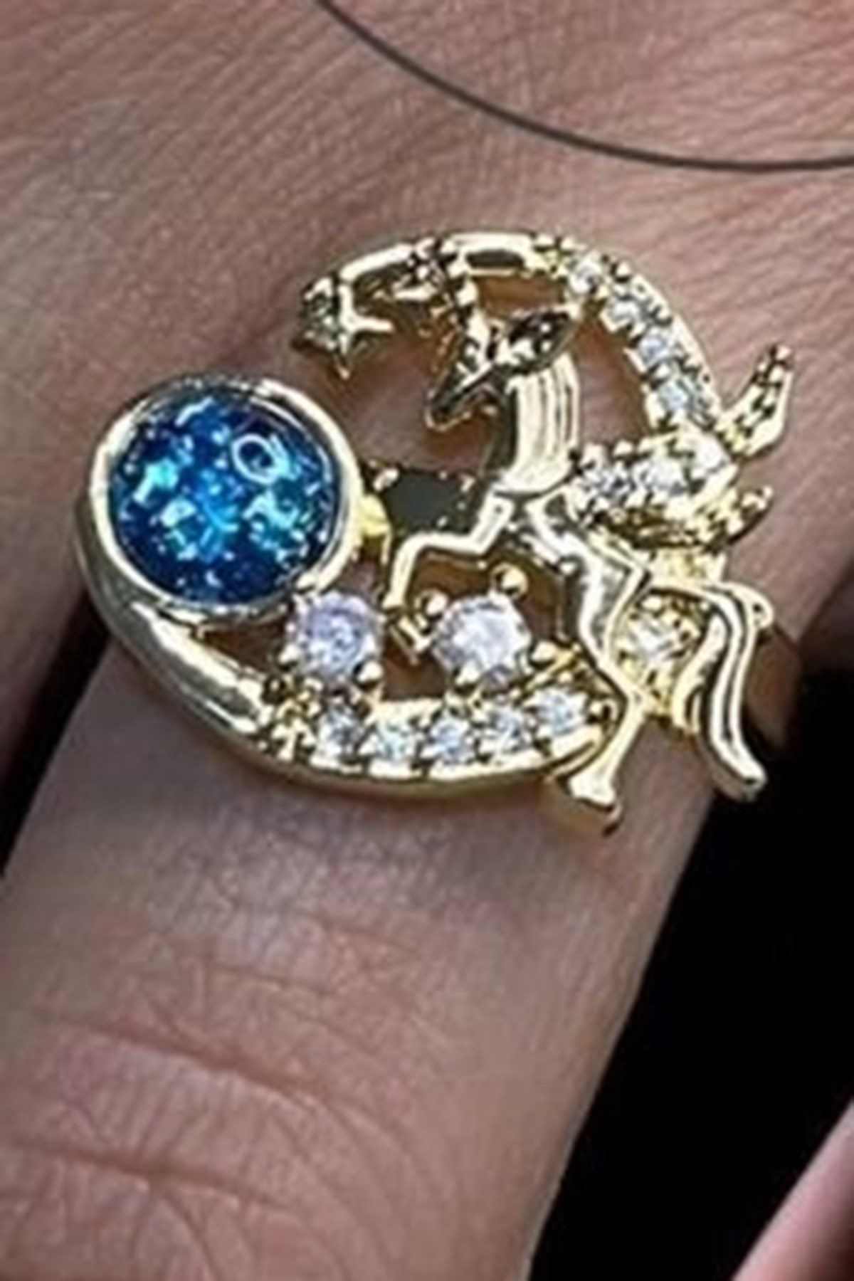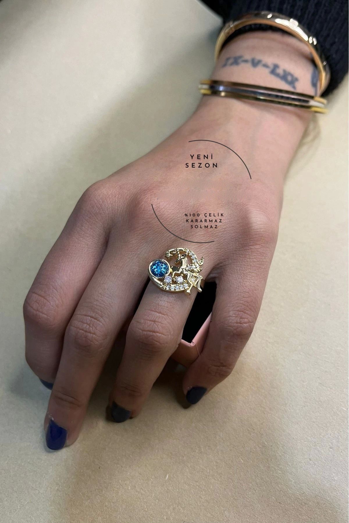 Toptan Altın Renk Mavi Küre Ve Unicorn Gezegen Model Zirkon Taşlı Çelik Ayarlanabilir Çelik Yüzük – 3105