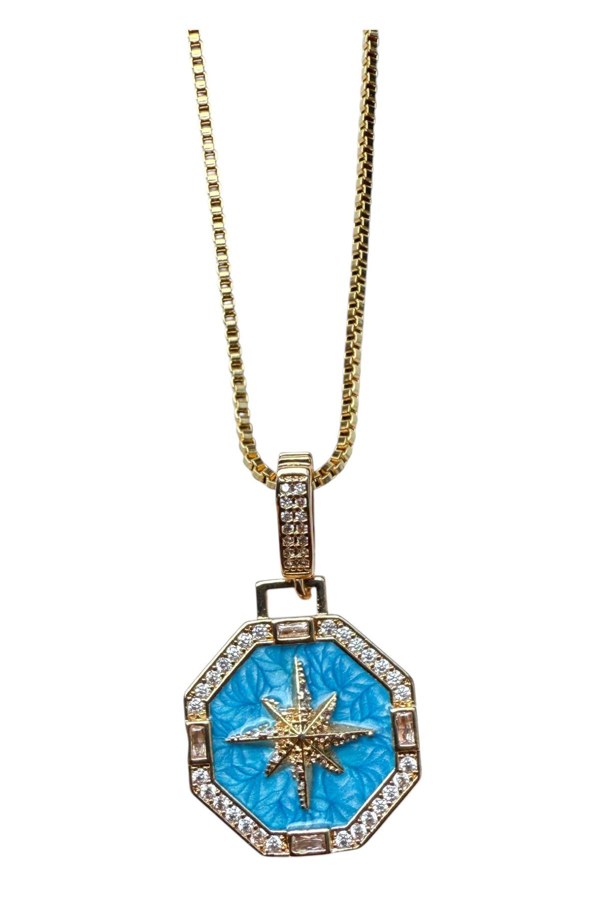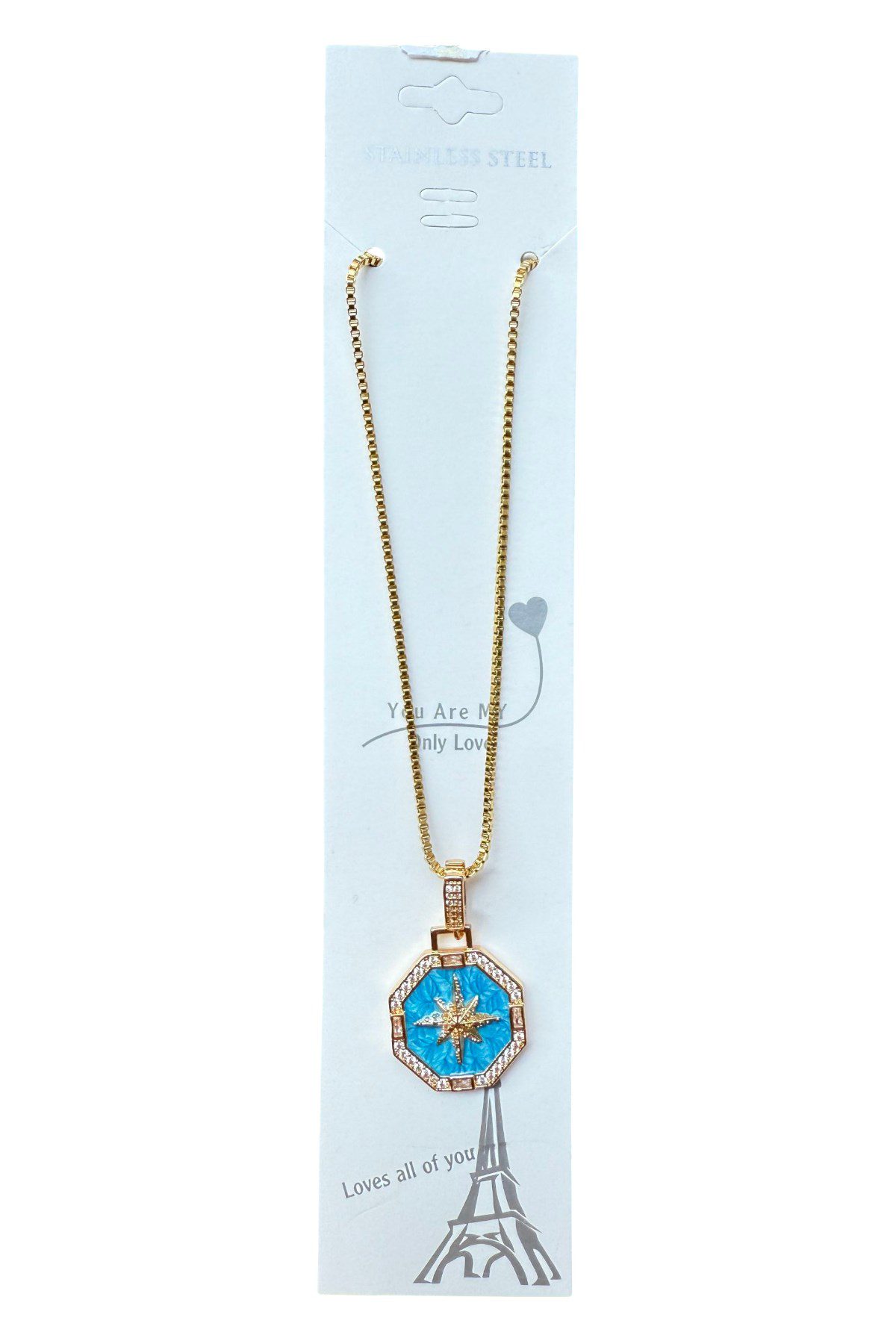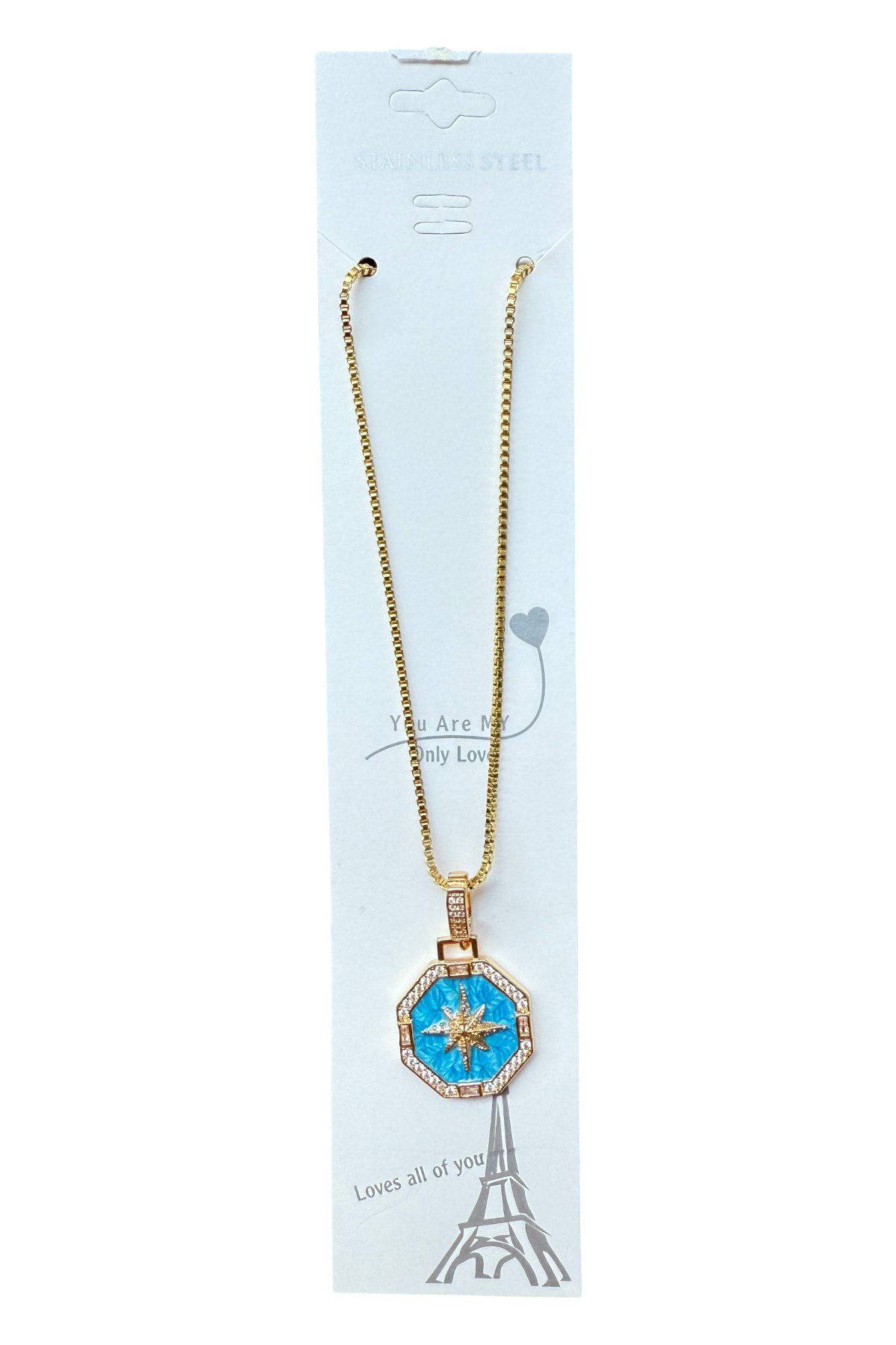 Toptan Altın Renk Mavi Mineli Yıldız 8 Köşeli Asansör Zincir Çelik Kolye – 3642