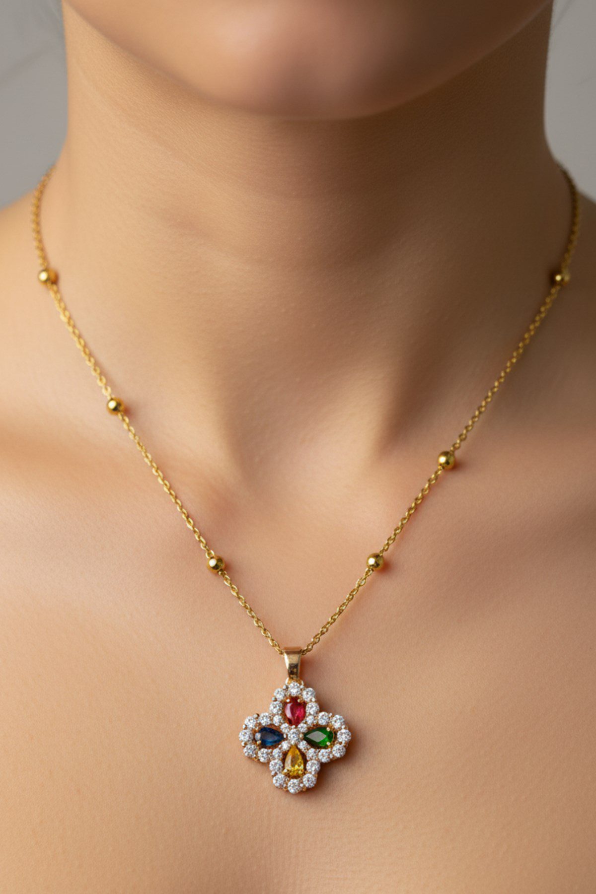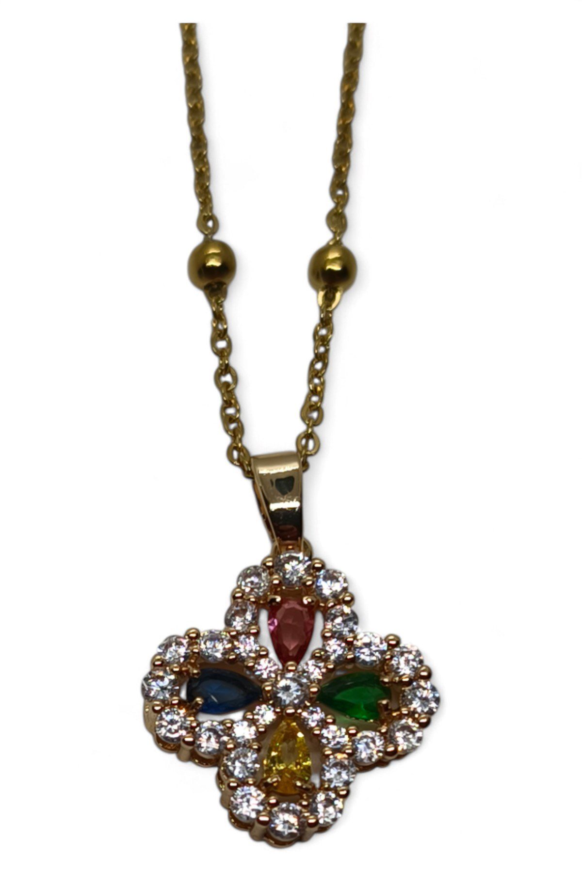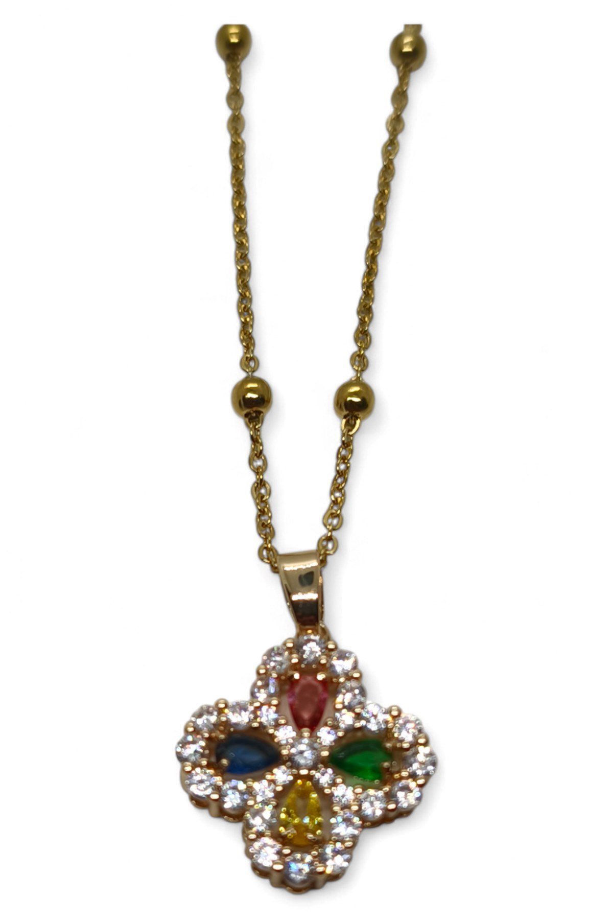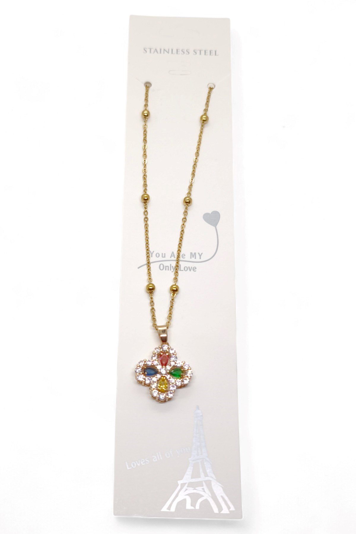 Toptan Altın Renk Mix Taşlı Yonca Model Top Zincir Çelik Kolye – 3683