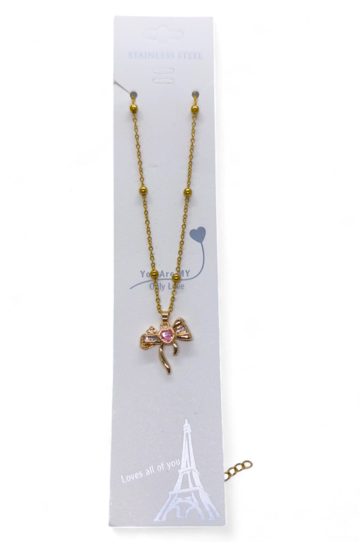 Toptan Altın Renk Pembe Taş Fiyonk Model Top Zincir Çelik Kolye- 3714