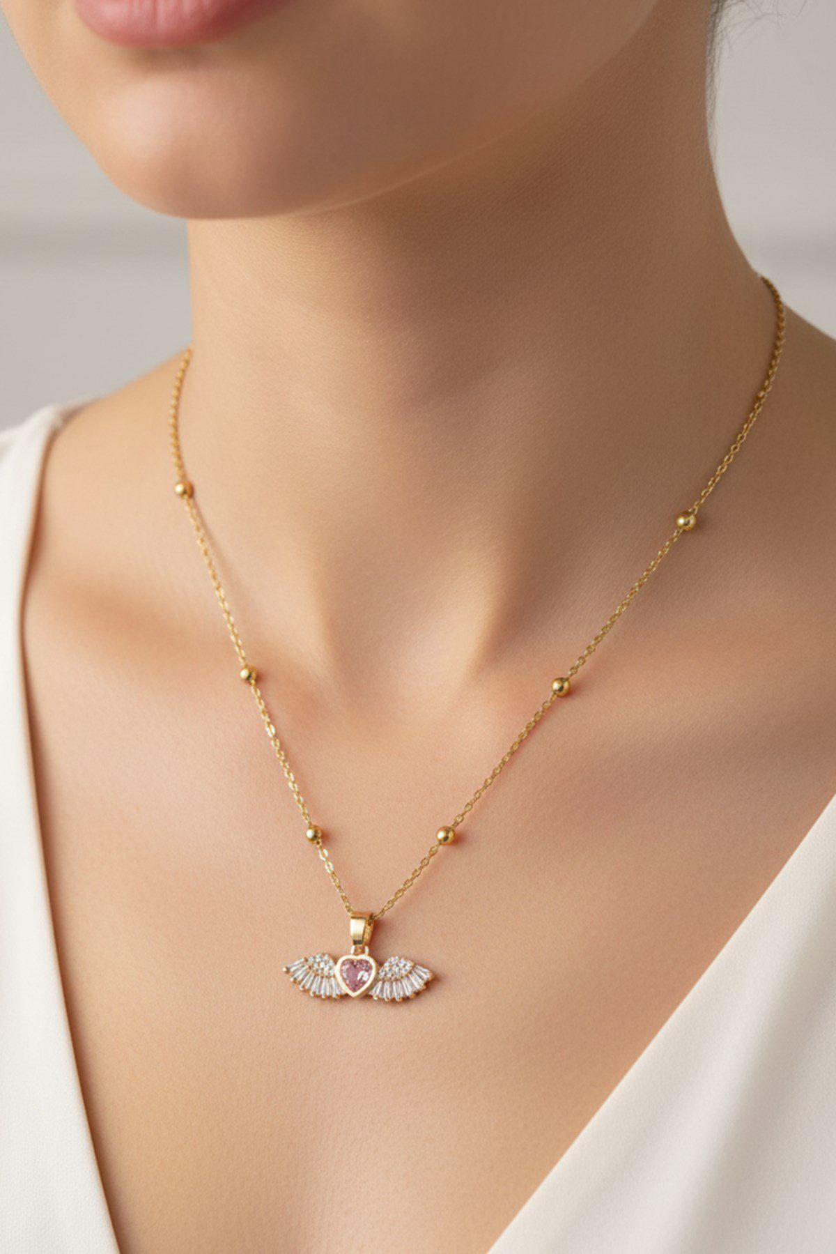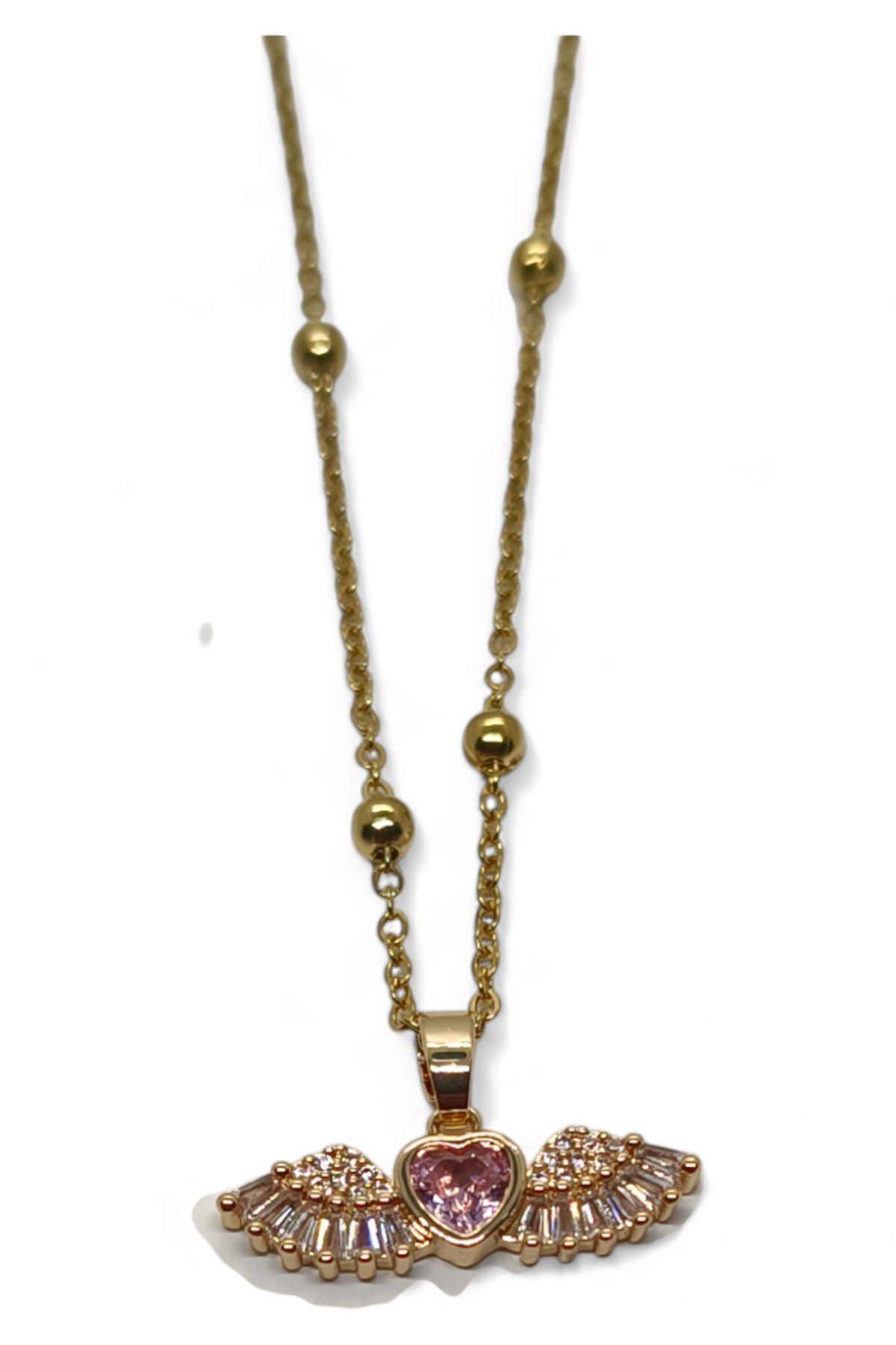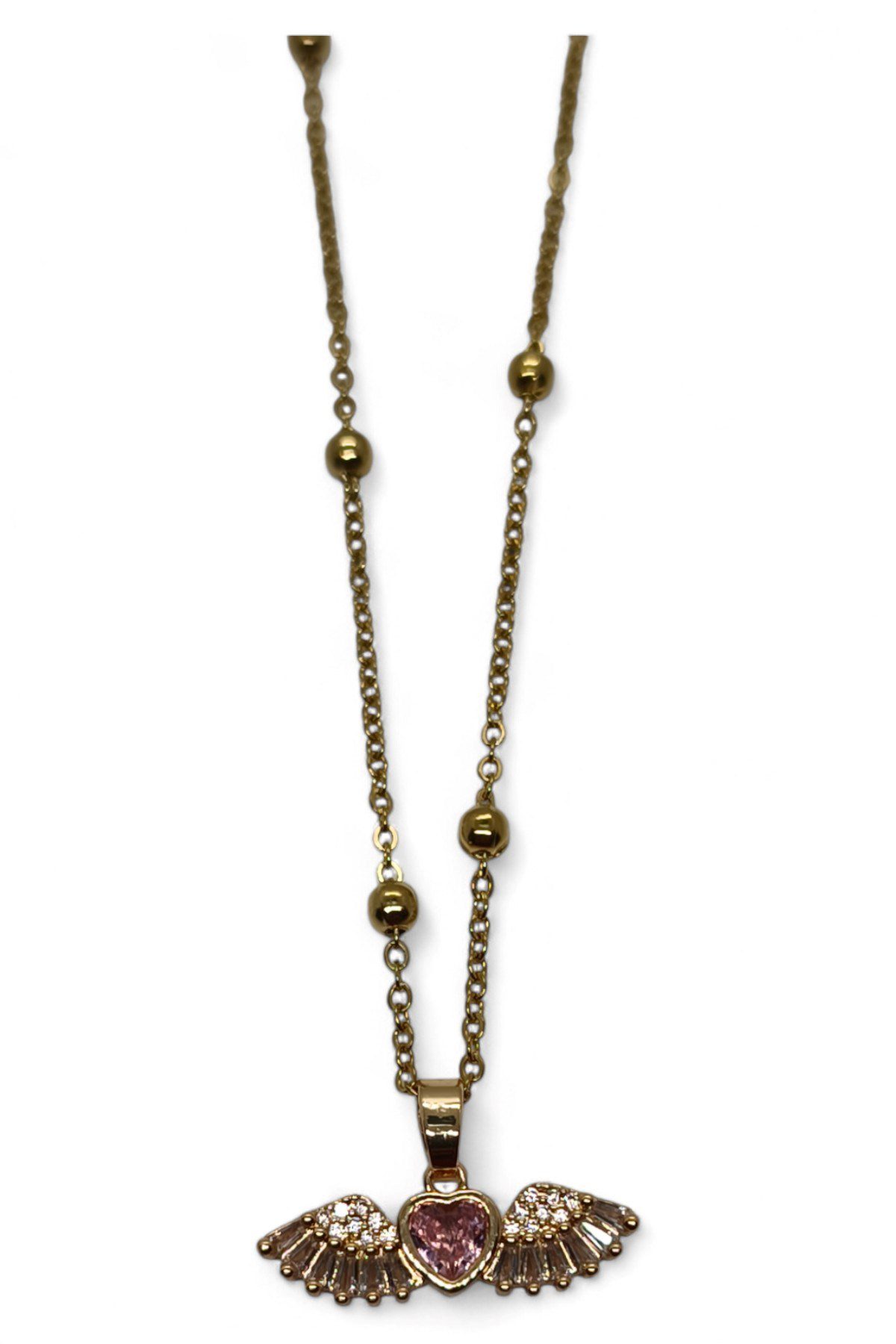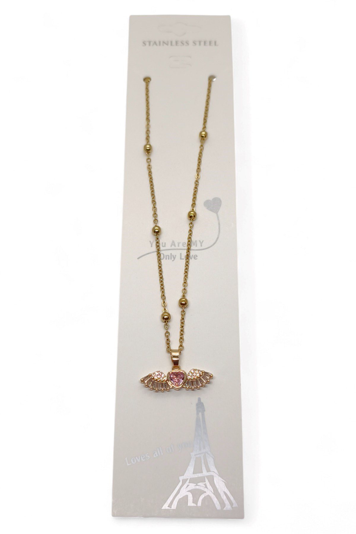 Toptan Altın Renk Pembe Taşlı Kanat Kalp Model Top Zincir Çelik Kolye – 3682
