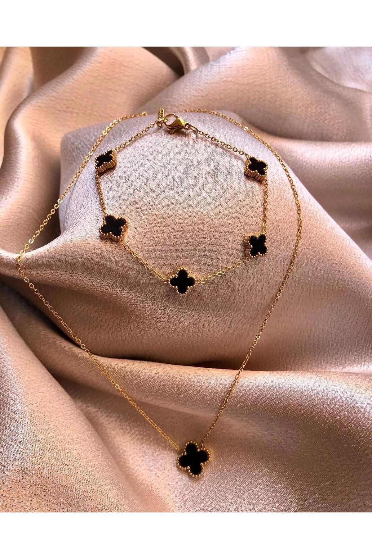 Toptan Altın Renk Siyah Sedef Van Cleef Kolye Bileklik Set – 3211