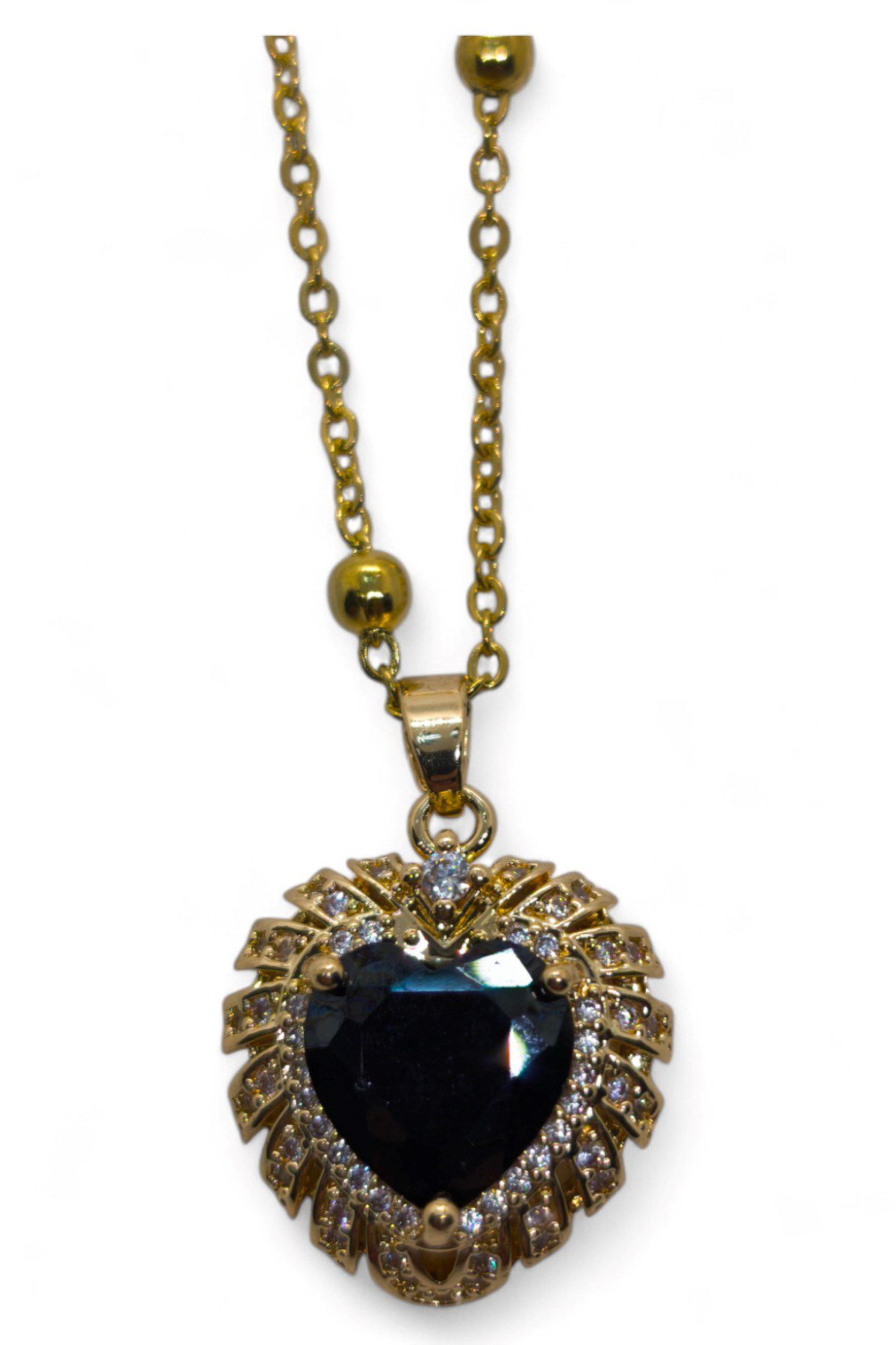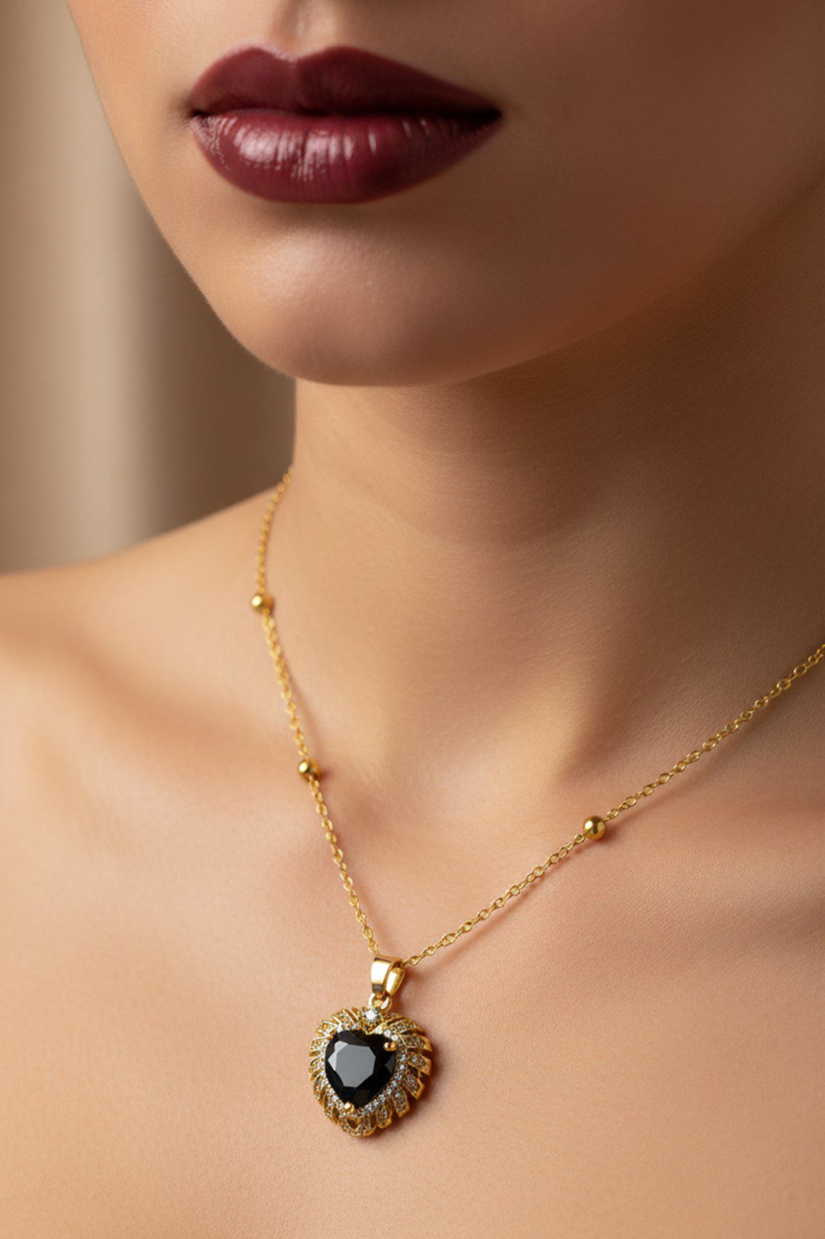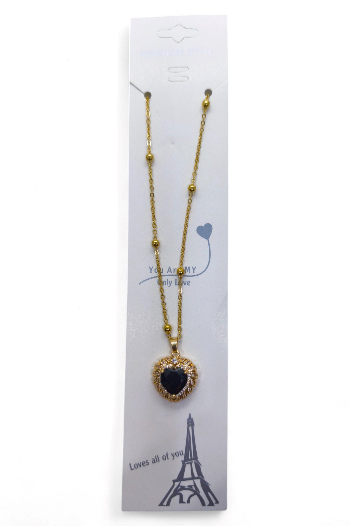 Toptan Altın Renk Siyah Taş Kalp Model Top Zincir Çelik Kolye- 3727