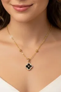 Toptan Altın Renk Siyah Taş Van Cleef Yonca Model Top Zincir Çelik Kolye – 3687