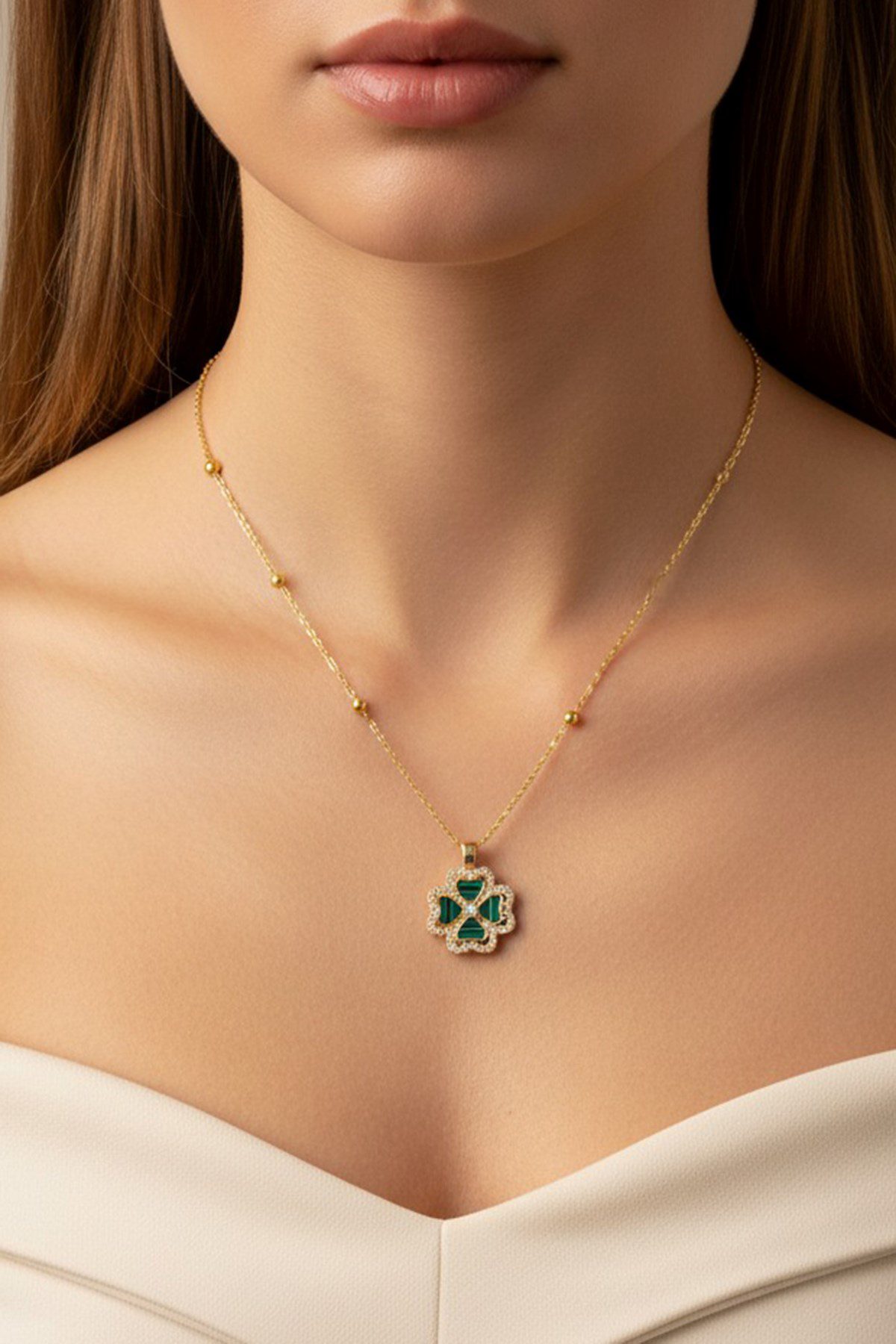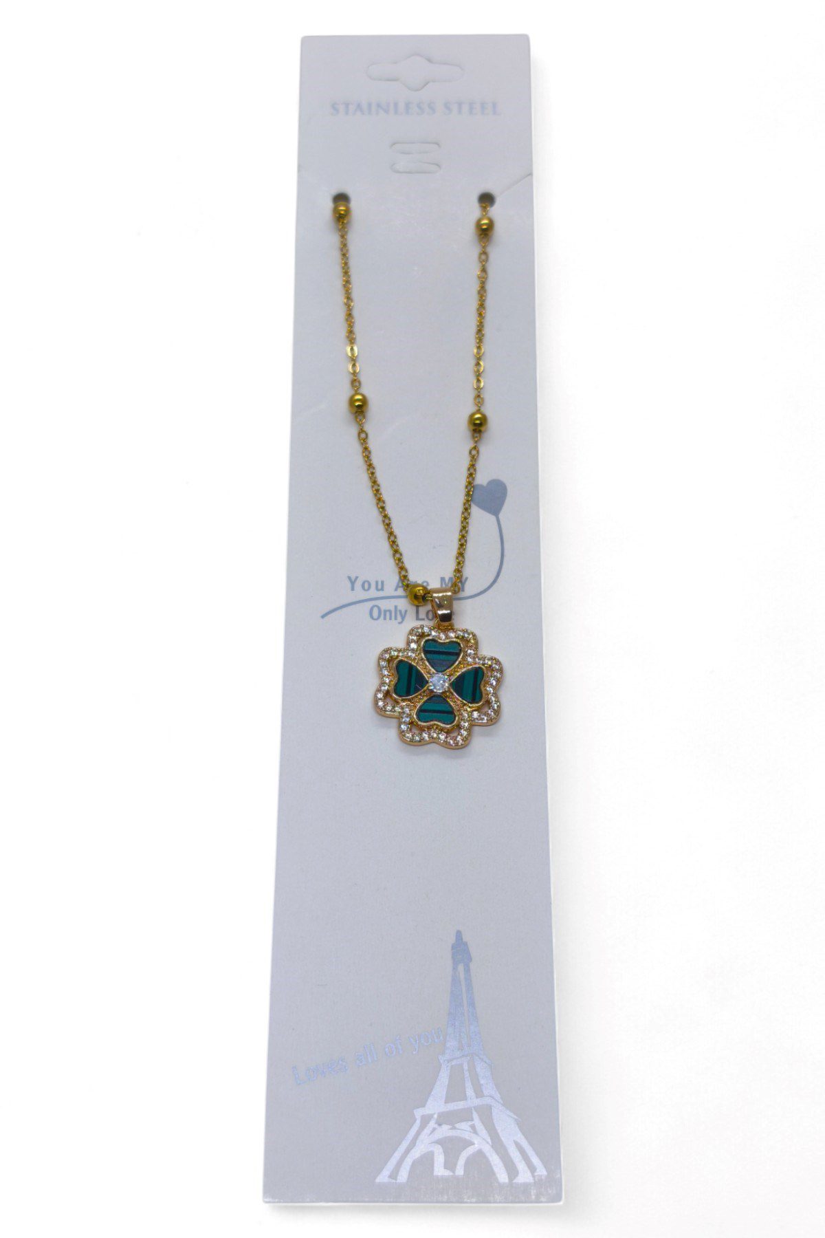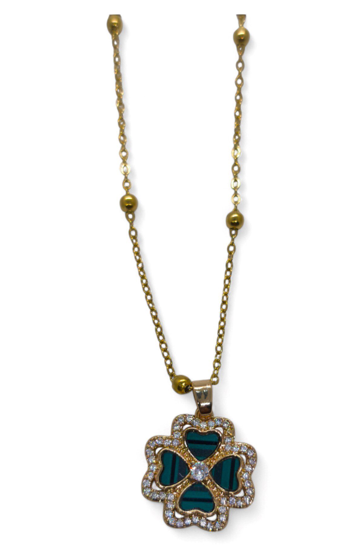 Toptan Altın Renk Yeşil Mineli Yonca Model Top Zincir Çelik Kolye – 3696