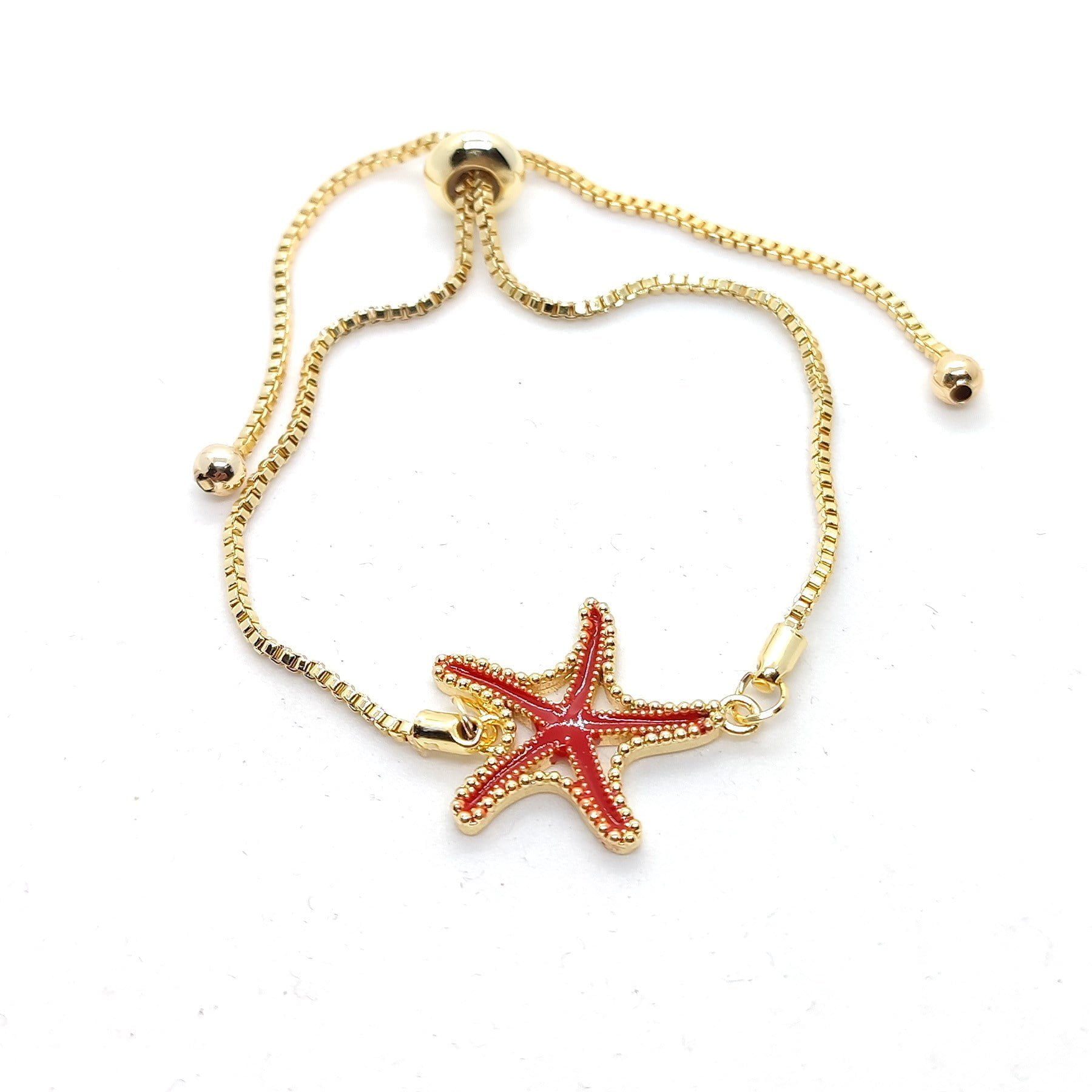 Toptan Altın Renk Zirkon Taşlı Kırmızı Mineli Deniz Yıldızı Asansör Bileklik