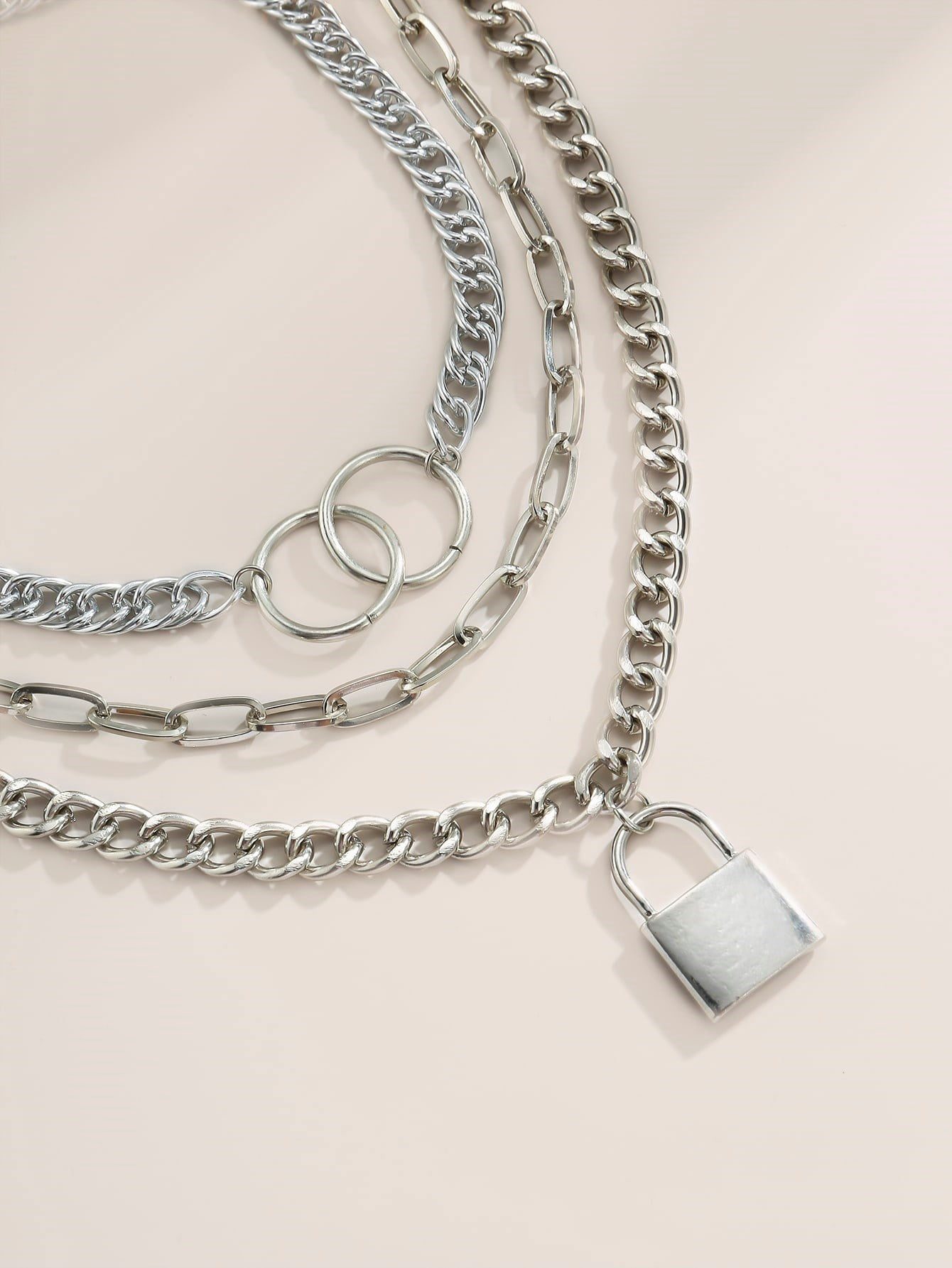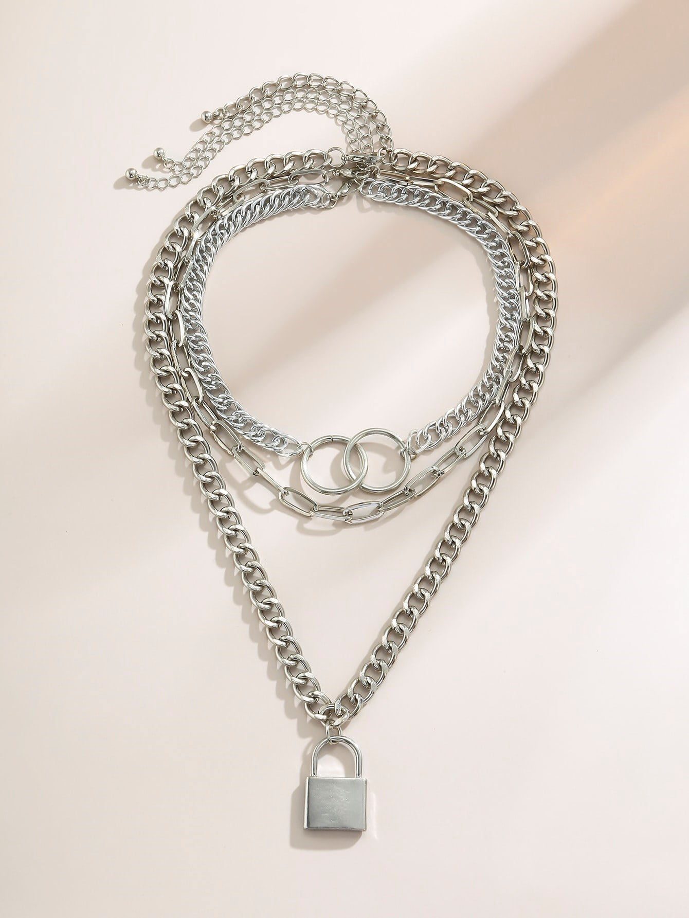 Toptan Gümüş Rengi Kilit ve Halka 3 Katmanlı Kolye