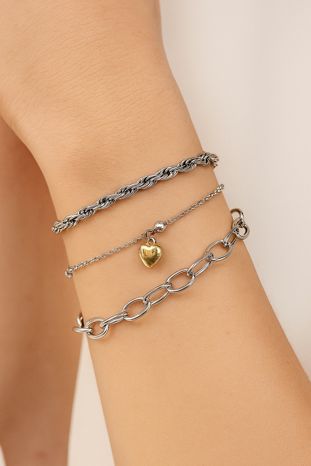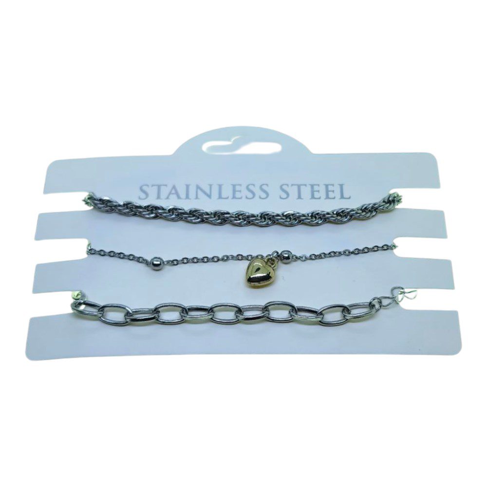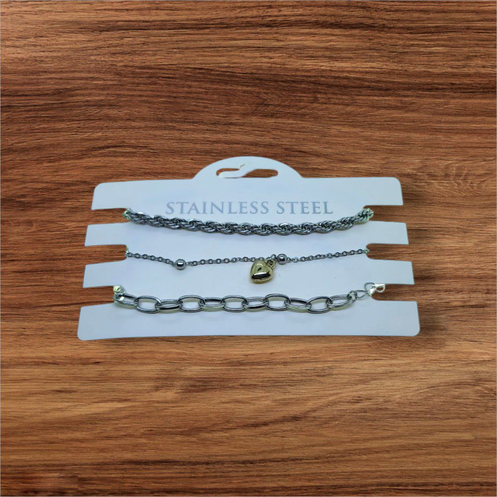 Toptan Gümüş Renk Burgu Top Kalp Dd Zincir Kombin Çelik Bileklik – 3324