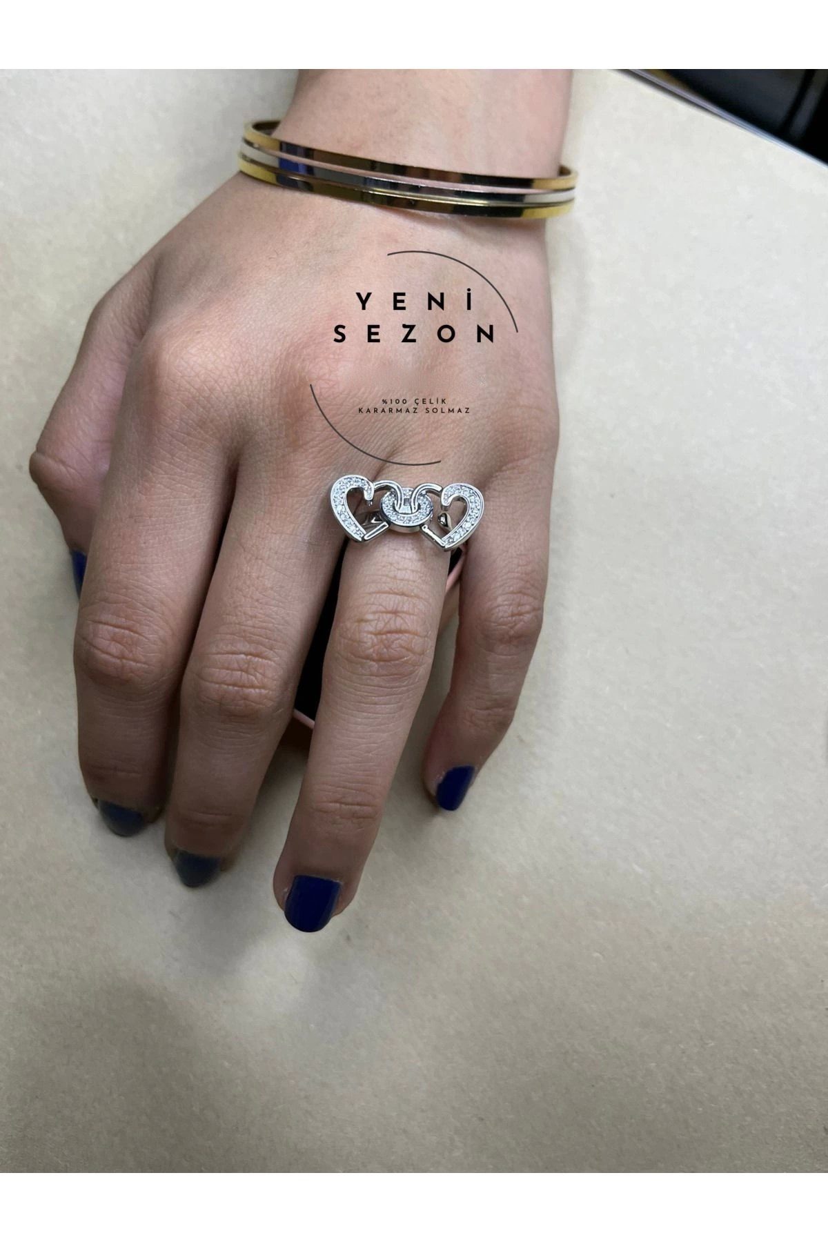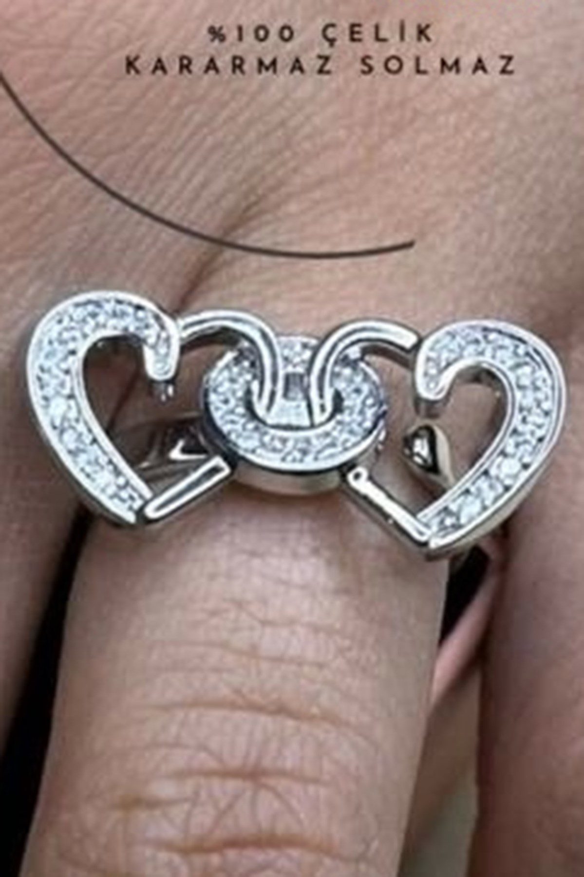 Toptan Gümüş Renk Çift Kalp Model Zirkon Taşlı Çelik Ayarlanabilir Çelik Yüzük – 3096