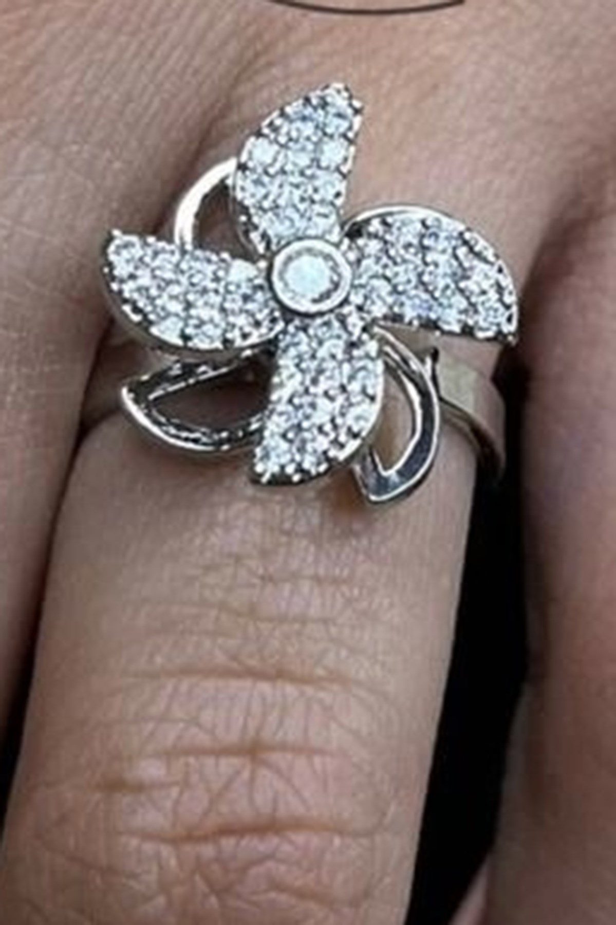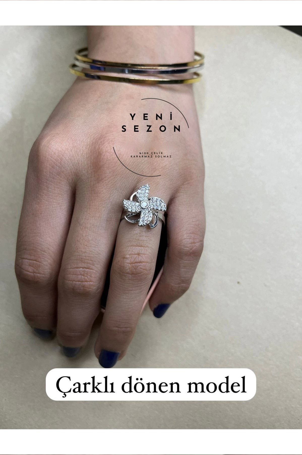 Toptan Gümüş Renk Dört Yaprak Model Zirkon Taşlı Çelik Ayarlanabilir Ucu Dönen Çelik Yüzük – 3083