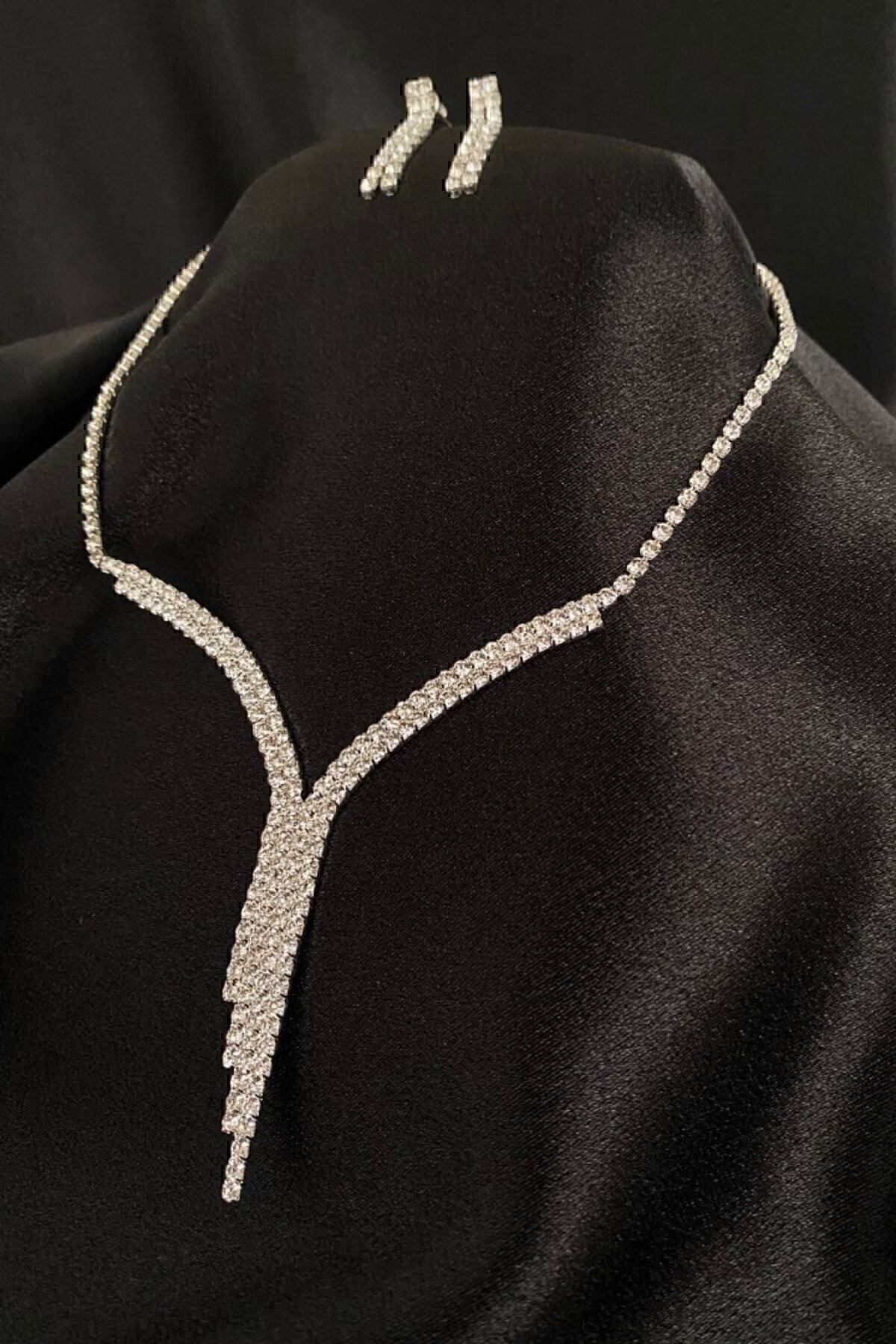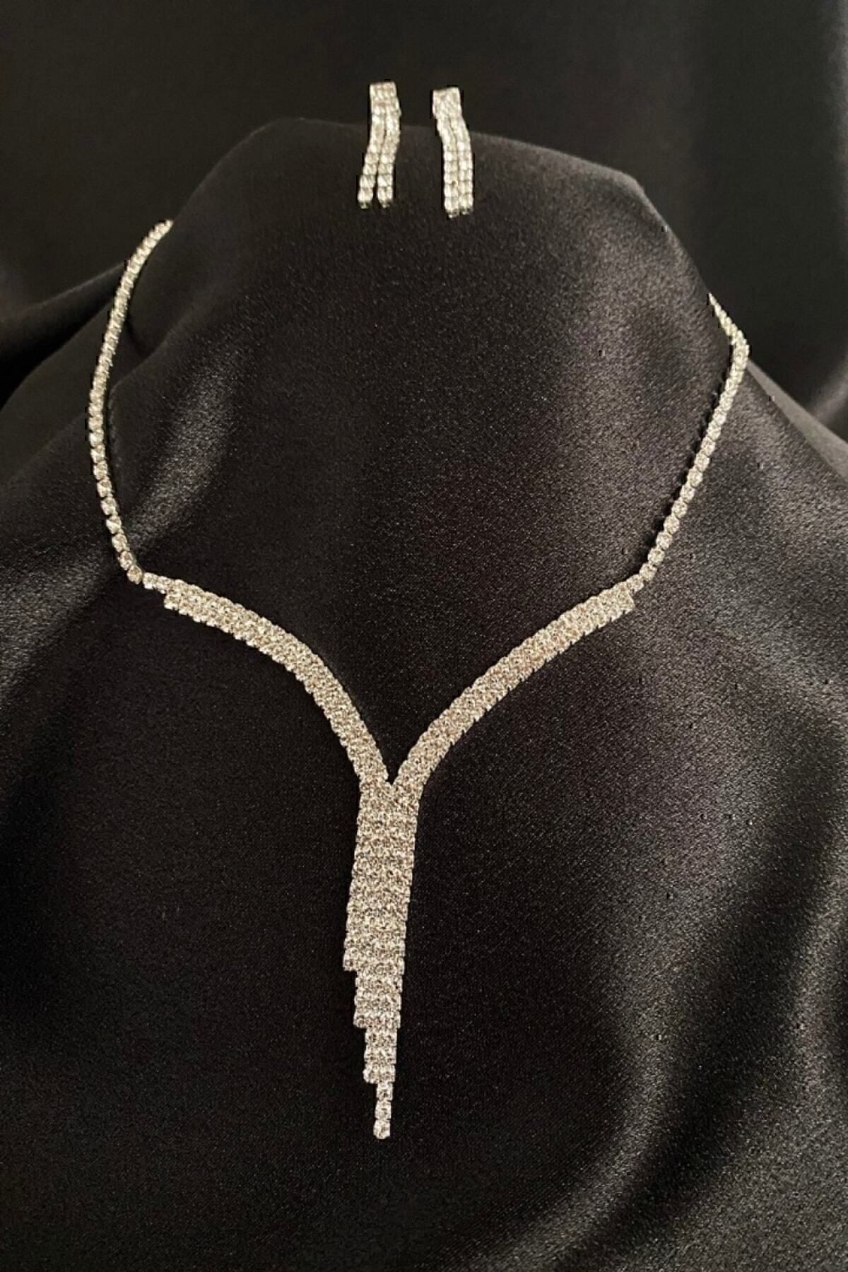 Toptan Gümüş Renk Düğün Nişan Kına Su Yolu Iki Sıra Zirkon Taşlı Bayan Abiye Küpe Kolye Set Takım – 3200