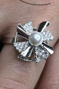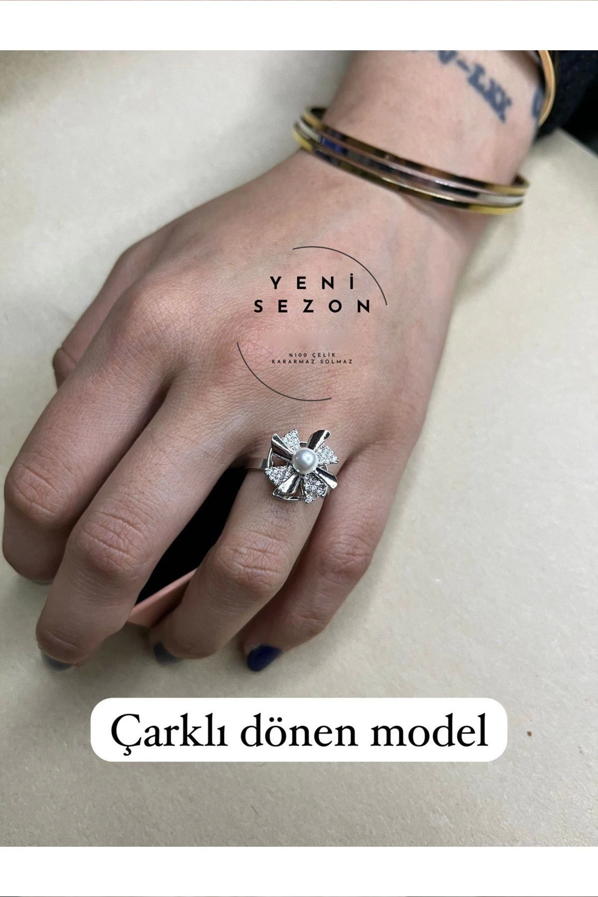 Toptan Gümüş Renk İnci Ve Kanat Model Zirkon Taşlı Çelik Ayarlanabilir Ucu Dönen Stres Çelik Yüzük – 3097