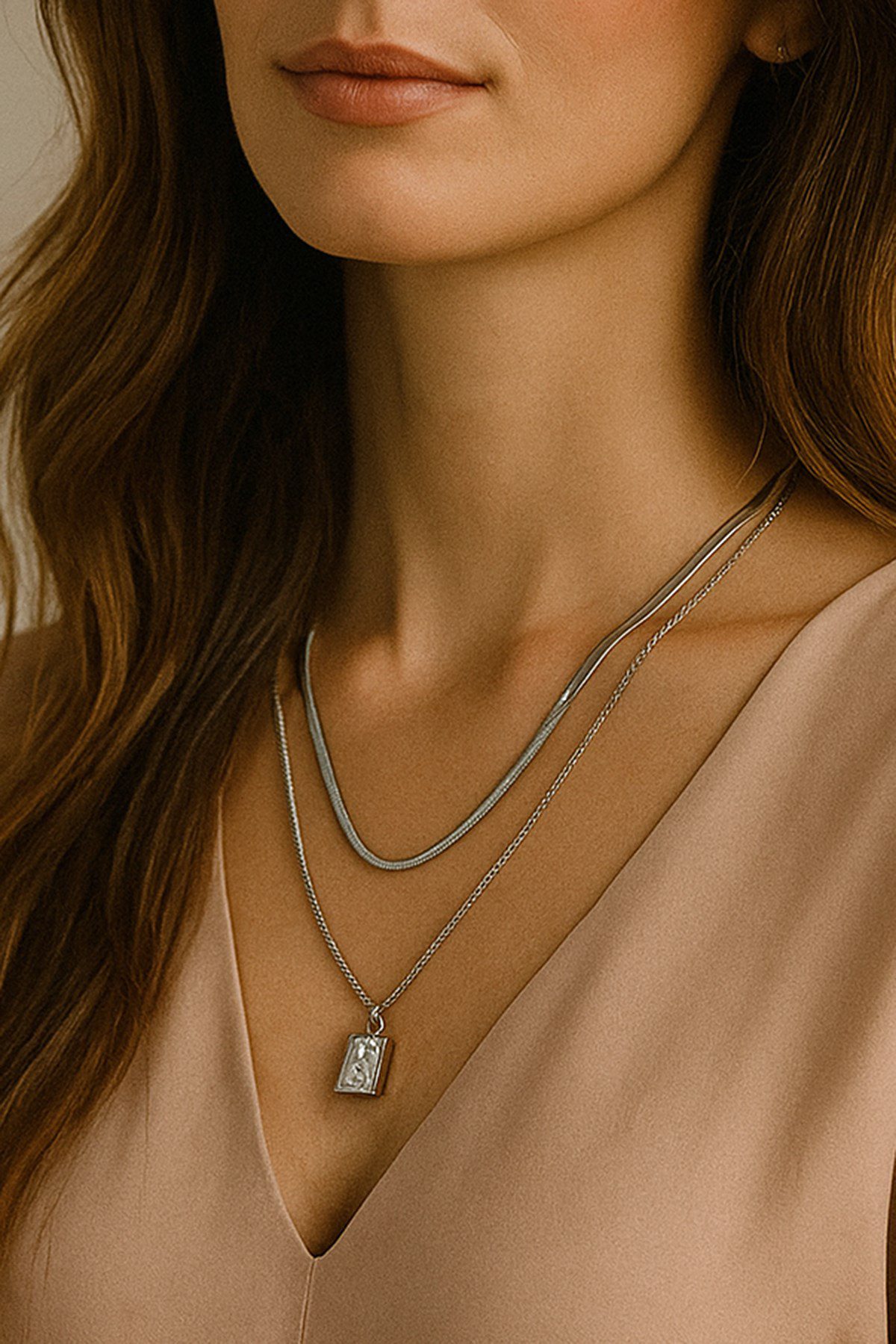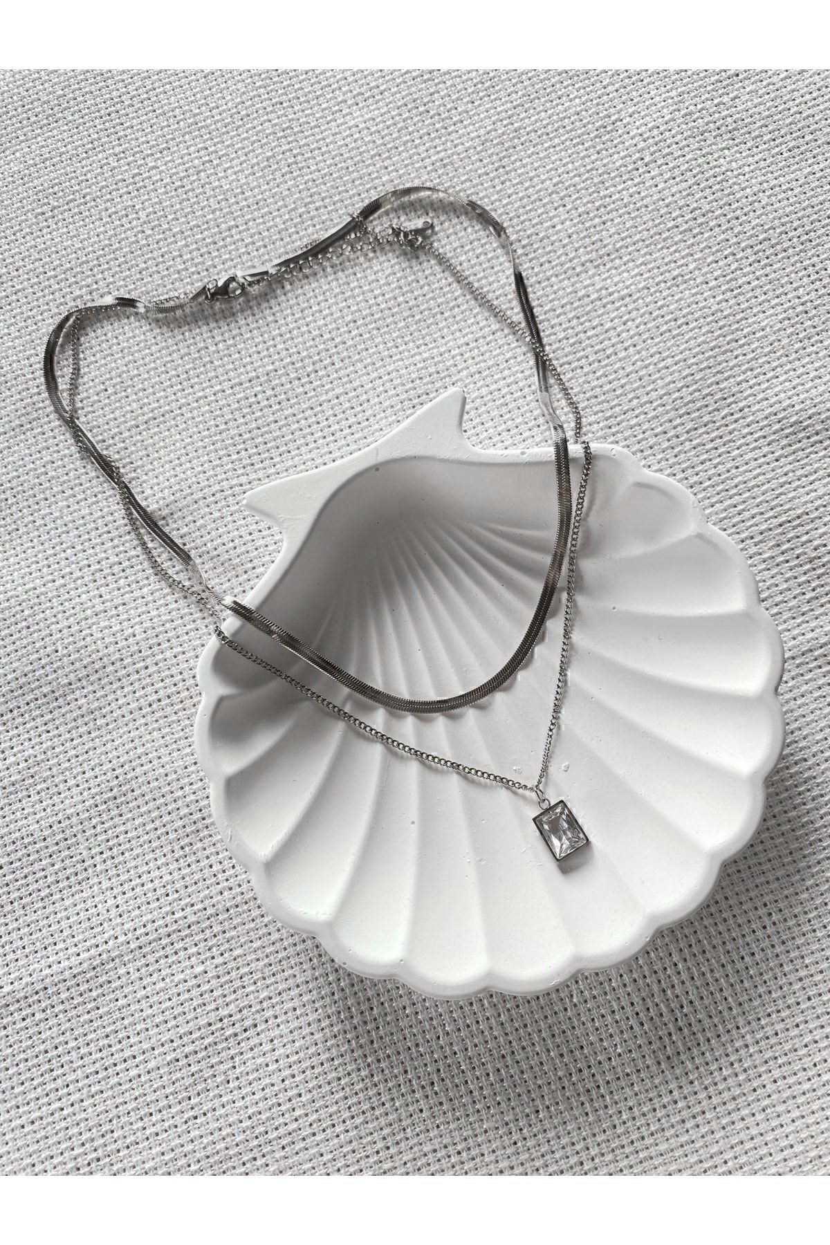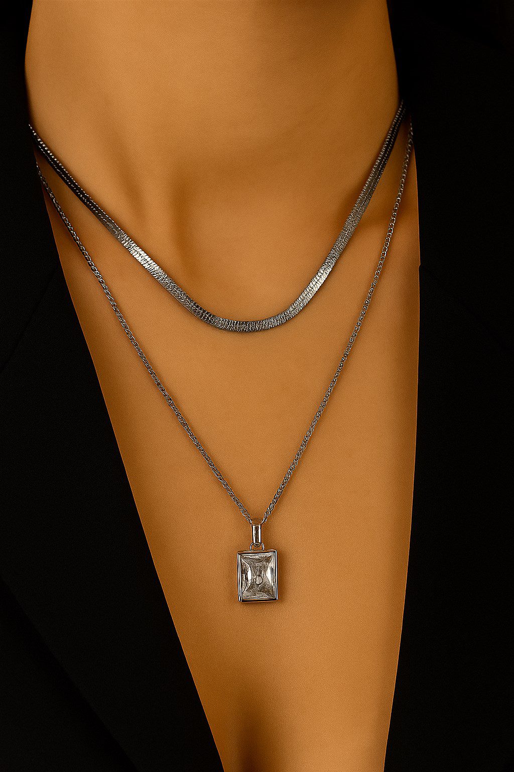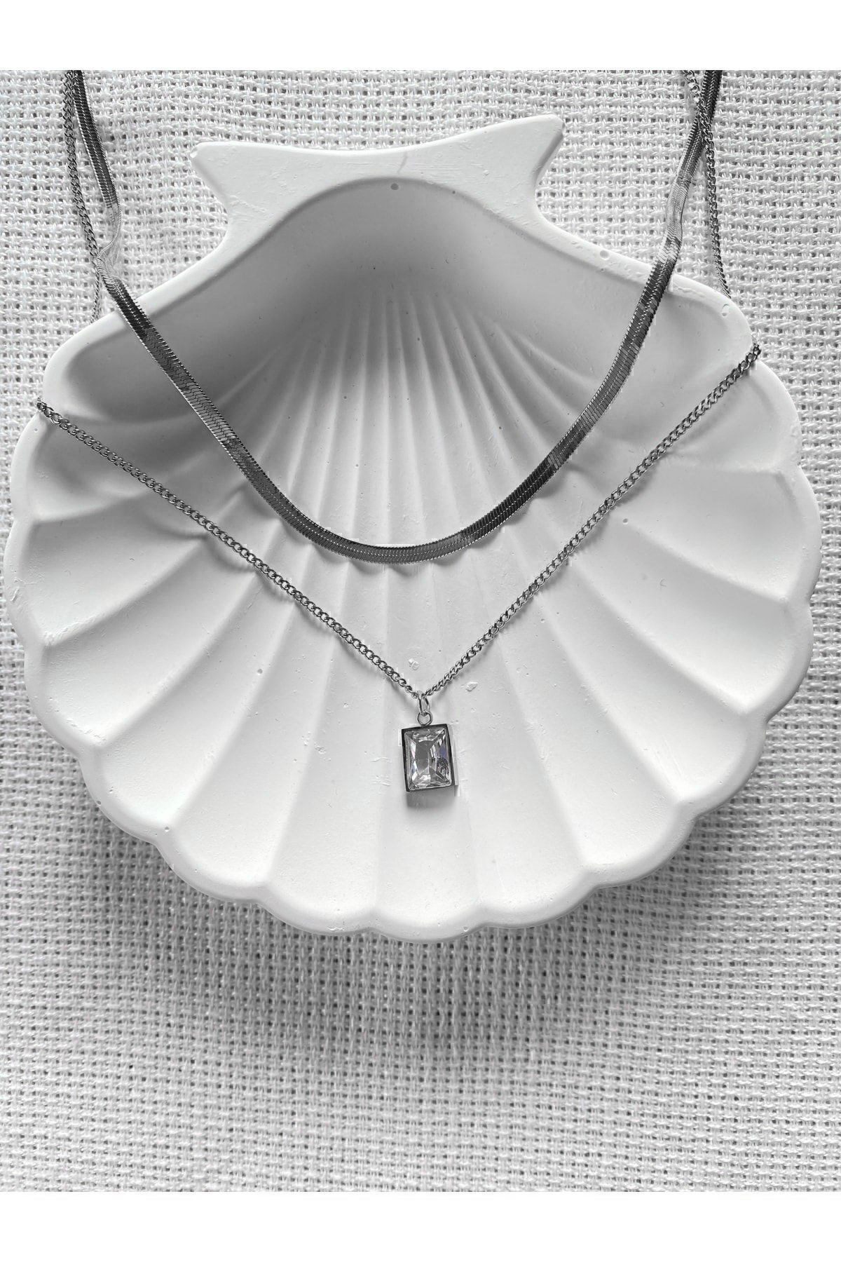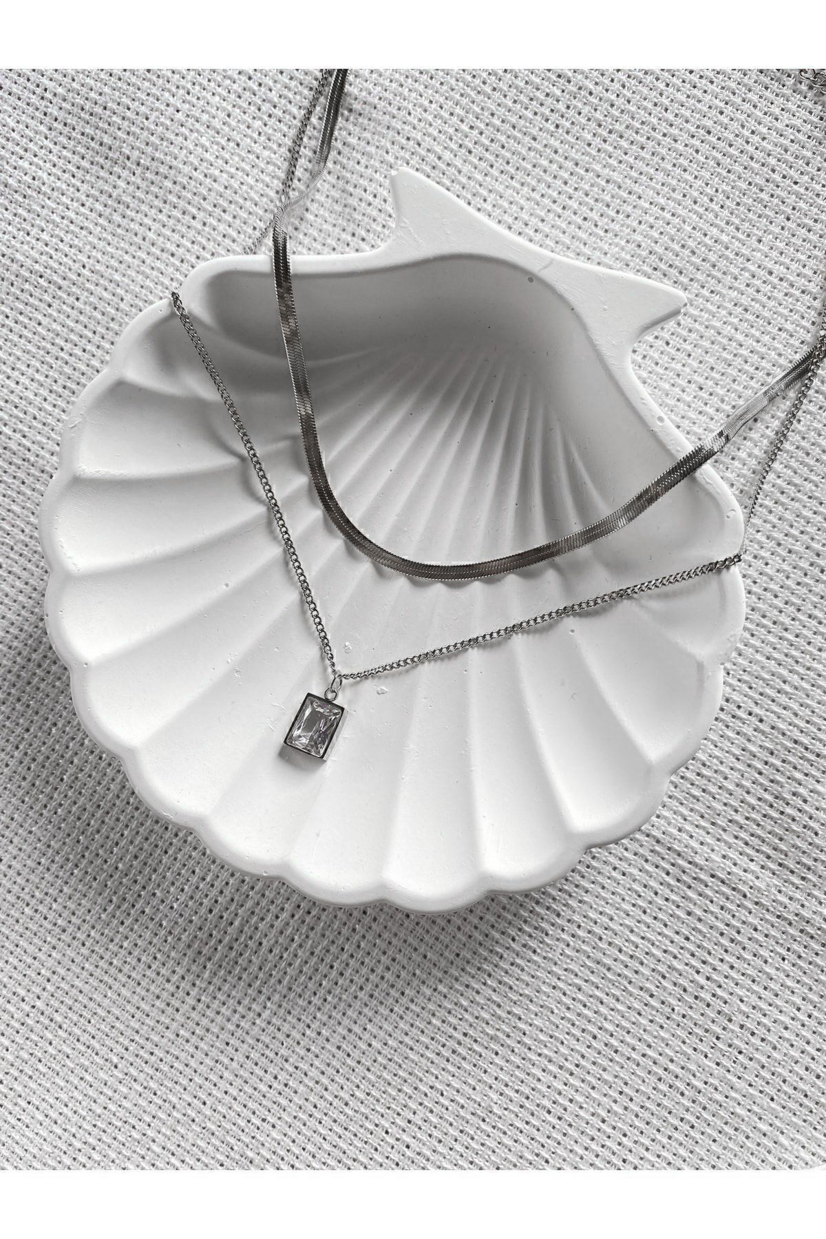 Toptan Gümüş Renk İtalyan Bakla Zincirli Baget Taşlı Çelik Kolye – 3219