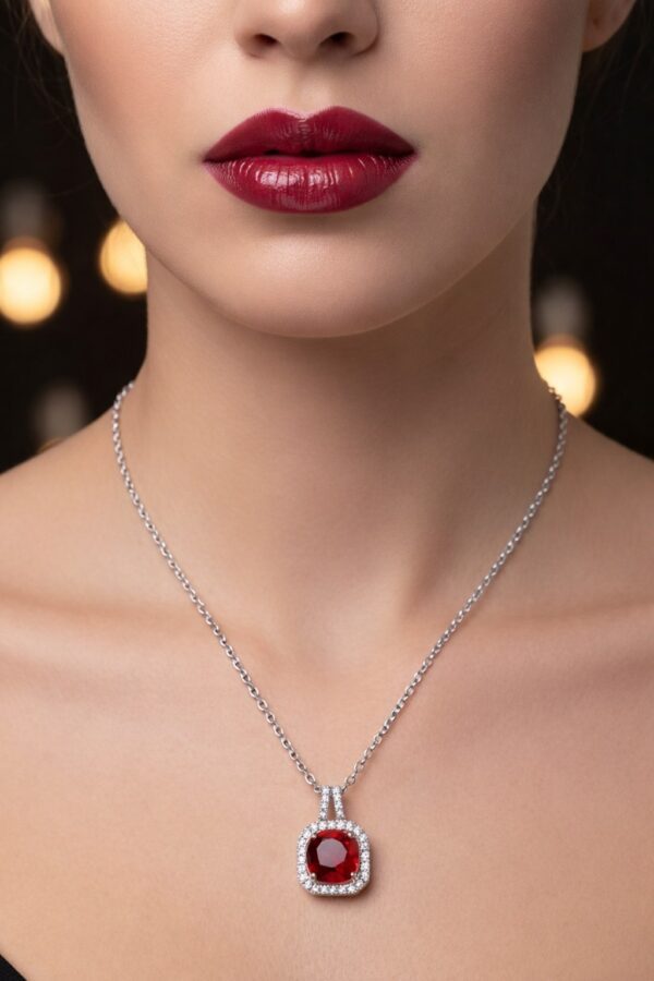 Toptan Gümüş Renk Kare Bordo Taş Sf Zincir Çelik Kolye – 3864