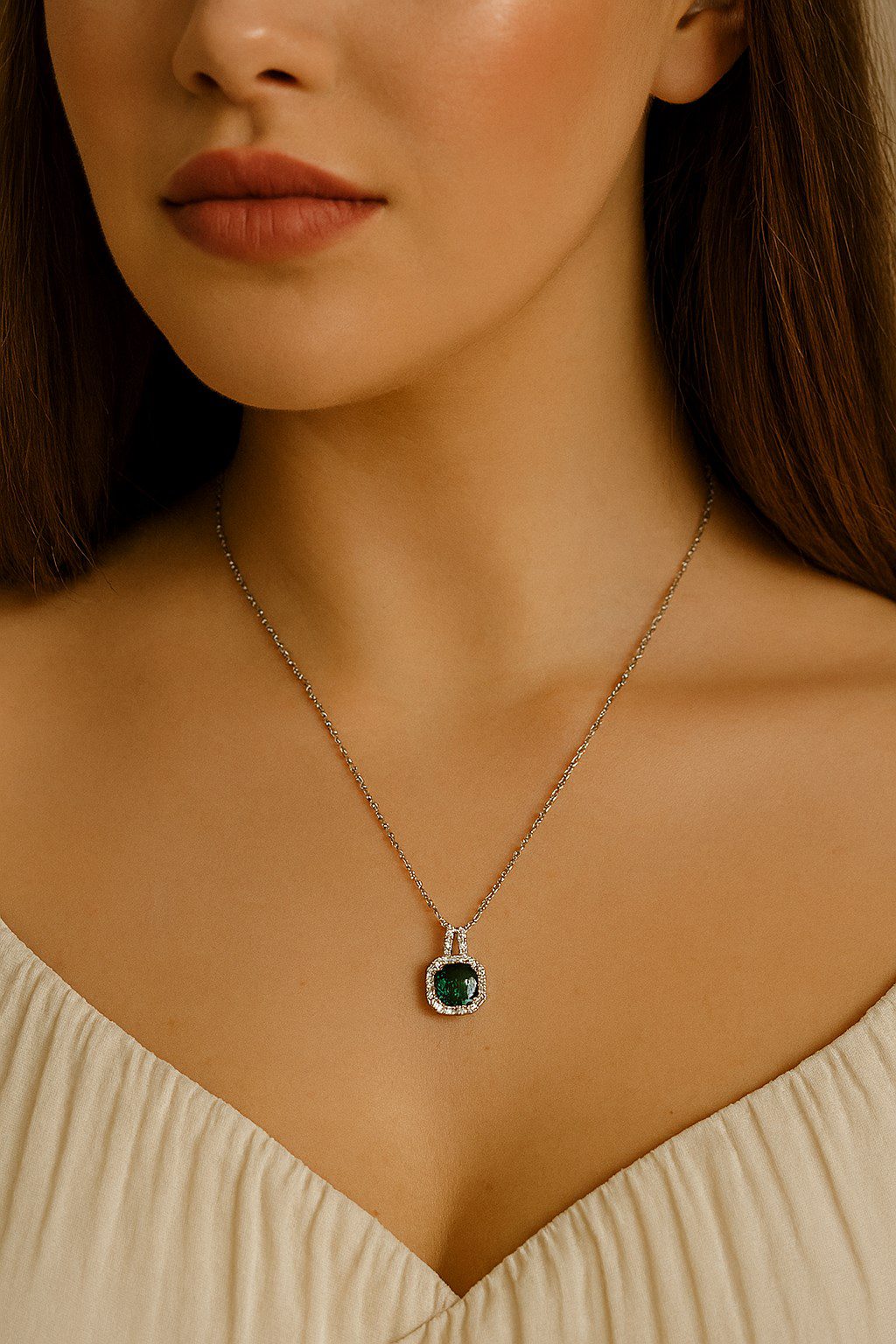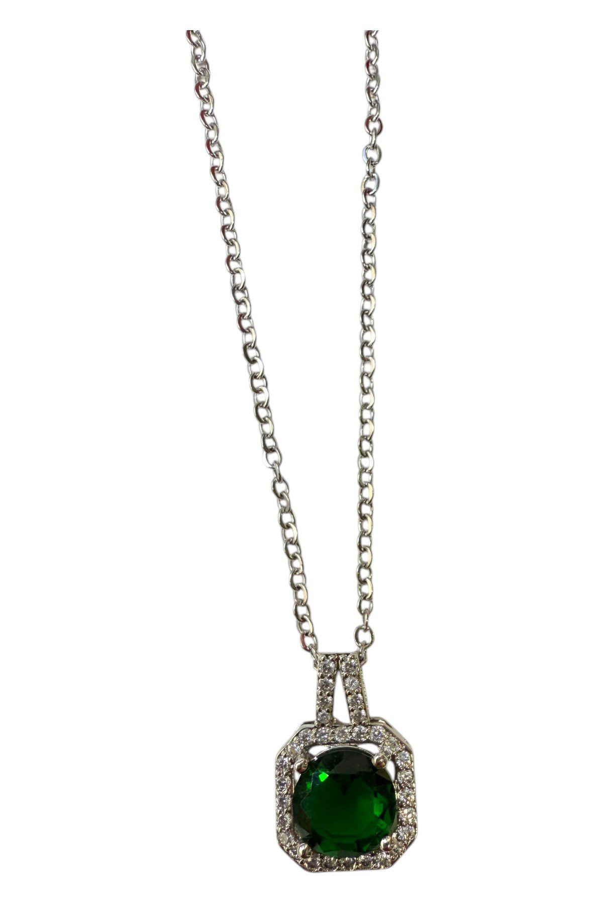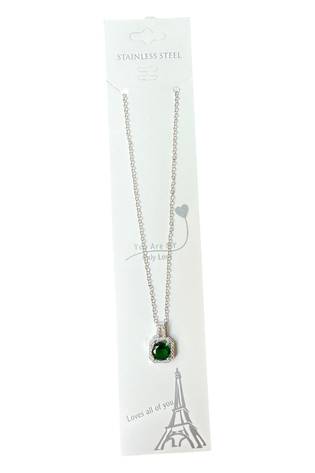 Toptan Gümüş Renk Kare Yeşil Taş Sf Zincir Çelik Kolye – 3660