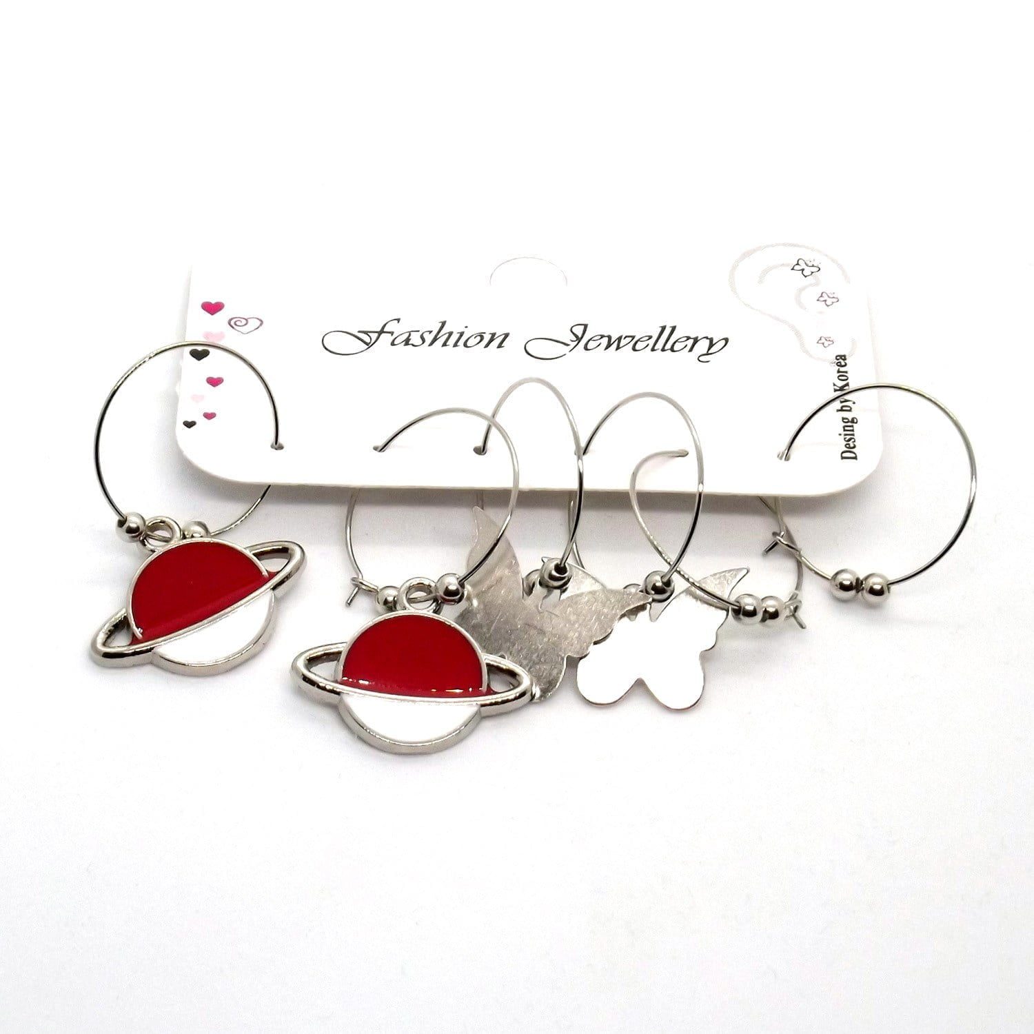 Toptan Gümüş Renk Kırmızı Beyaz Mineli Gezegen Kelebek Figurlu Kombin Küpe 712