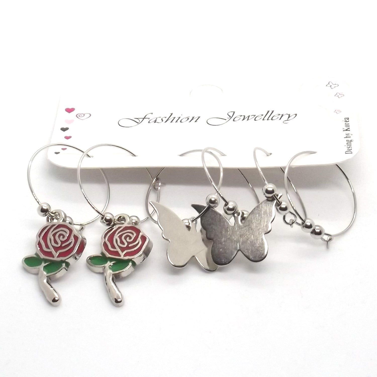 Toptan Gümüş Renk Kırmızı Mineli Çiçek Kelebek Figurlu Kombin Küpe 701