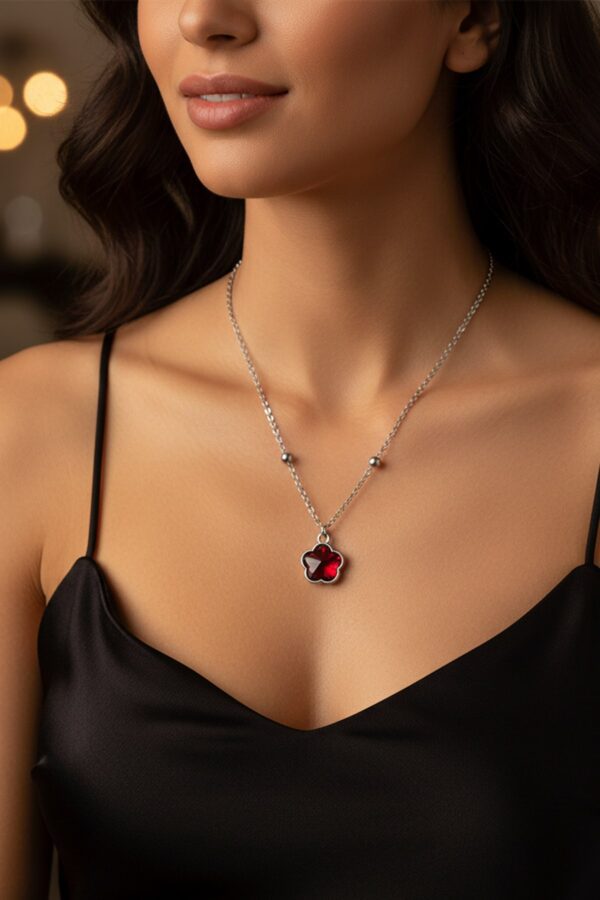 Toptan Gümüş Renk Kırmızı Taş Beş Yapraklı Stilize Çiçek Model Top Zincir Çelik Kolye – 3792