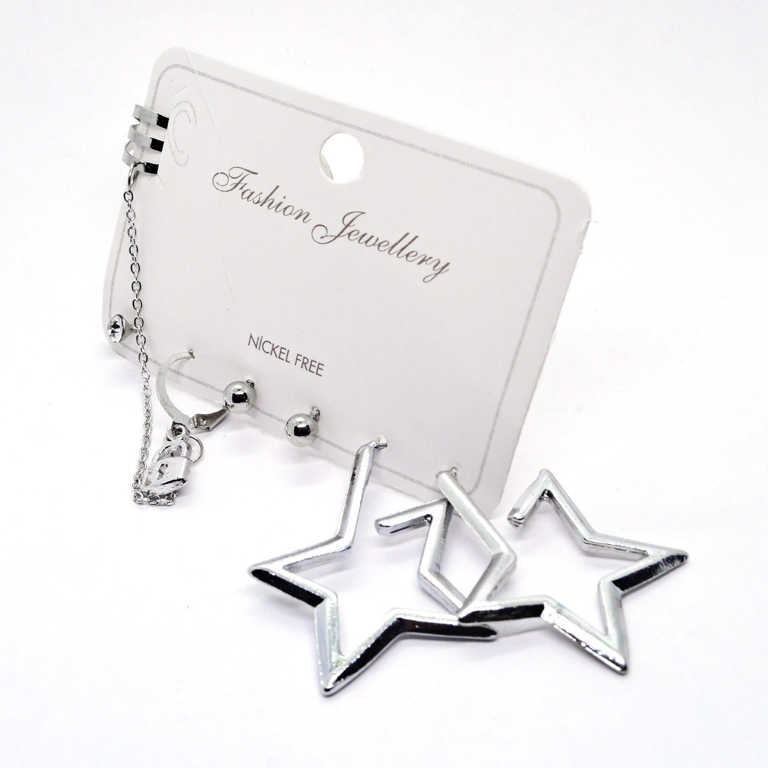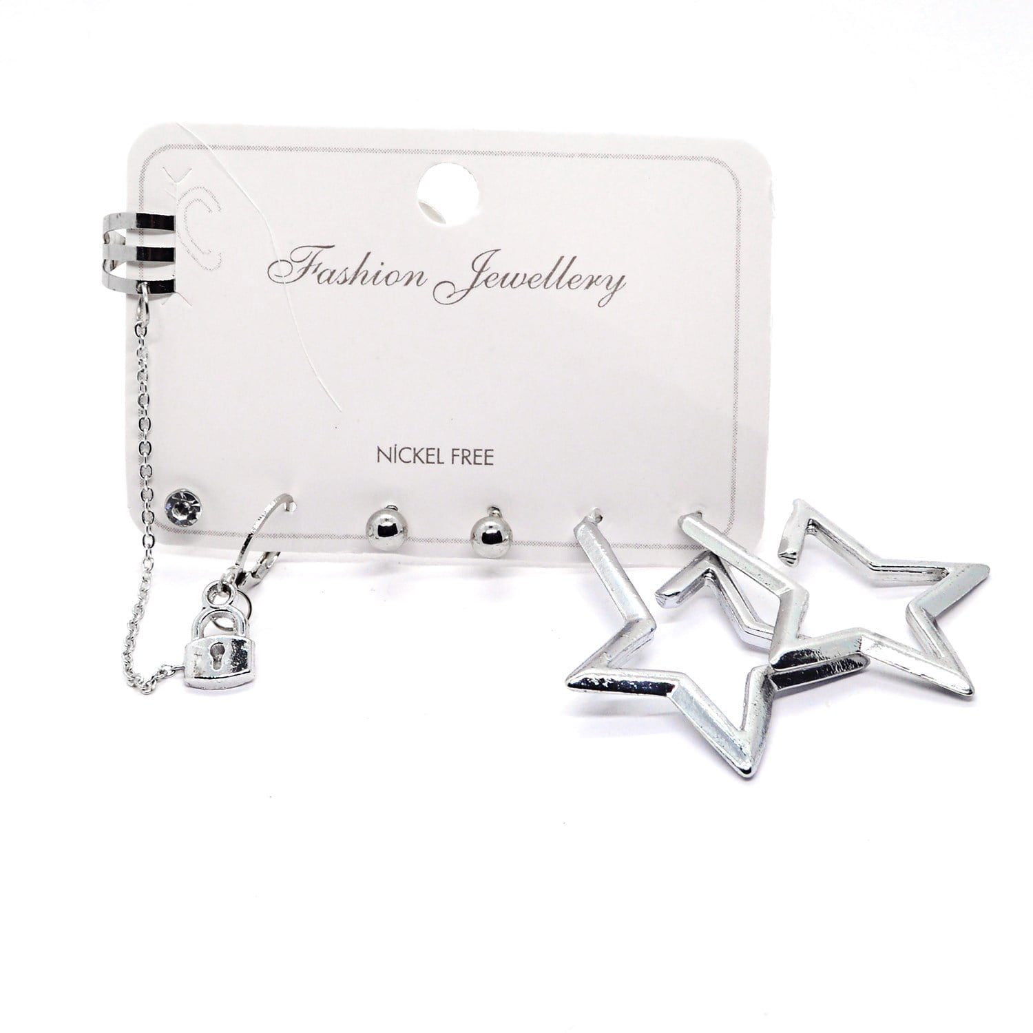 Toptan Gümüş Renk Kombin Küpe Kilit Yıldız – 1008