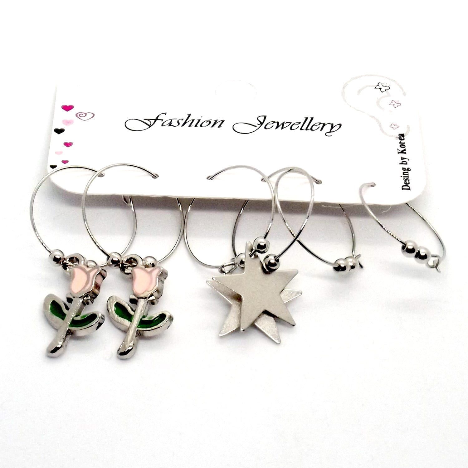 Toptan Gümüş Renk Pembe Mineli Çiçek Yıldız Figurlu Kombin Küpe 711