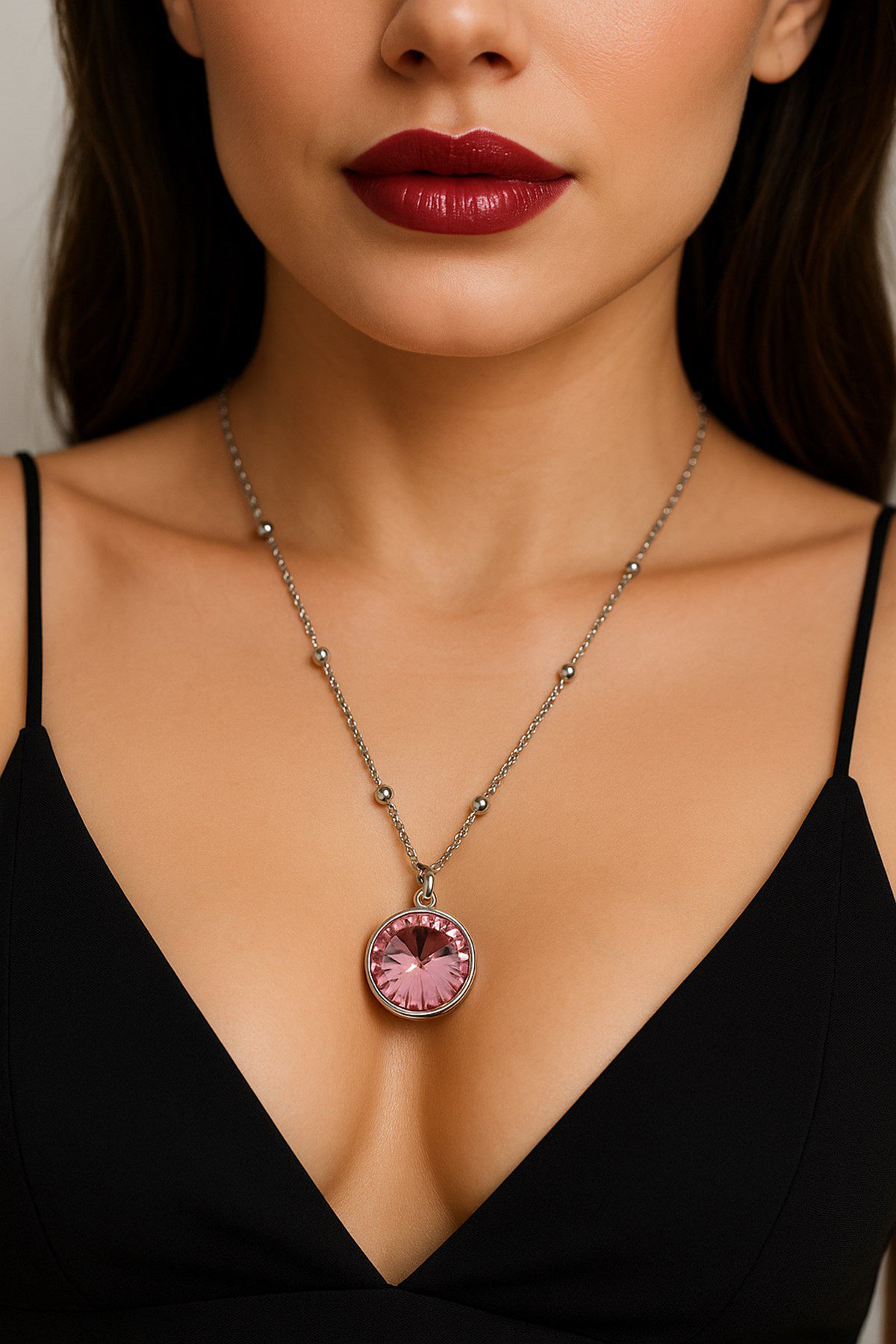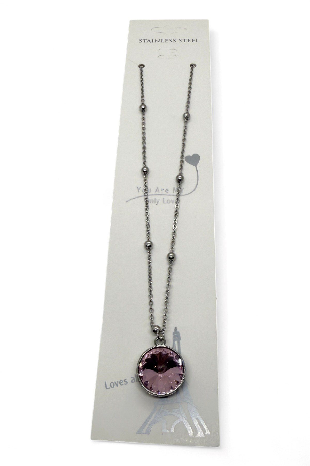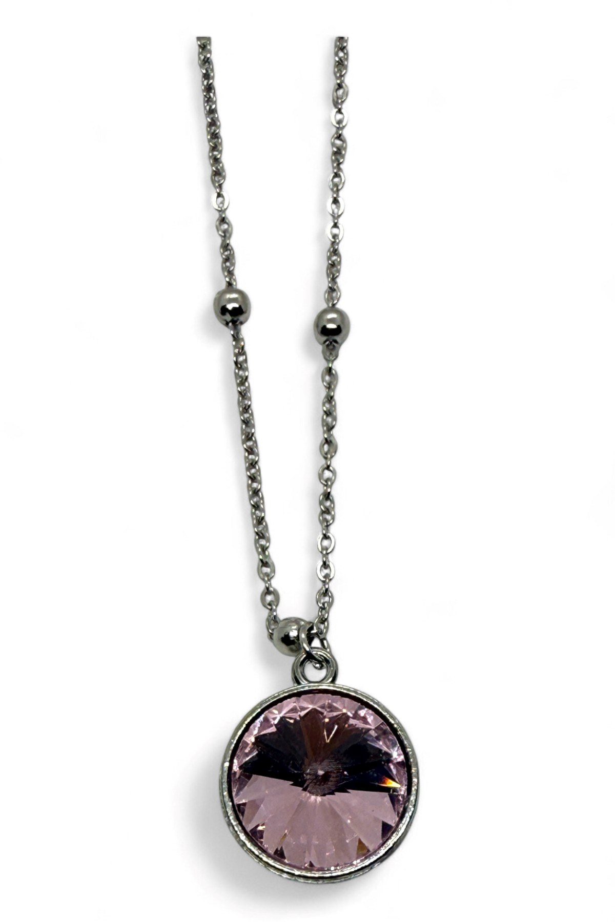 Toptan Gümüş Renk Pembe Taş Yuvarlak Model Top Zincir Çelik Kolye – 3767