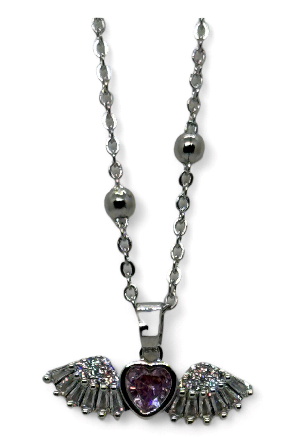 Toptan Gümüş Renk Pembe Taşlı Kanat Kalp Model Top Zincir Çelik Kolye – 3773