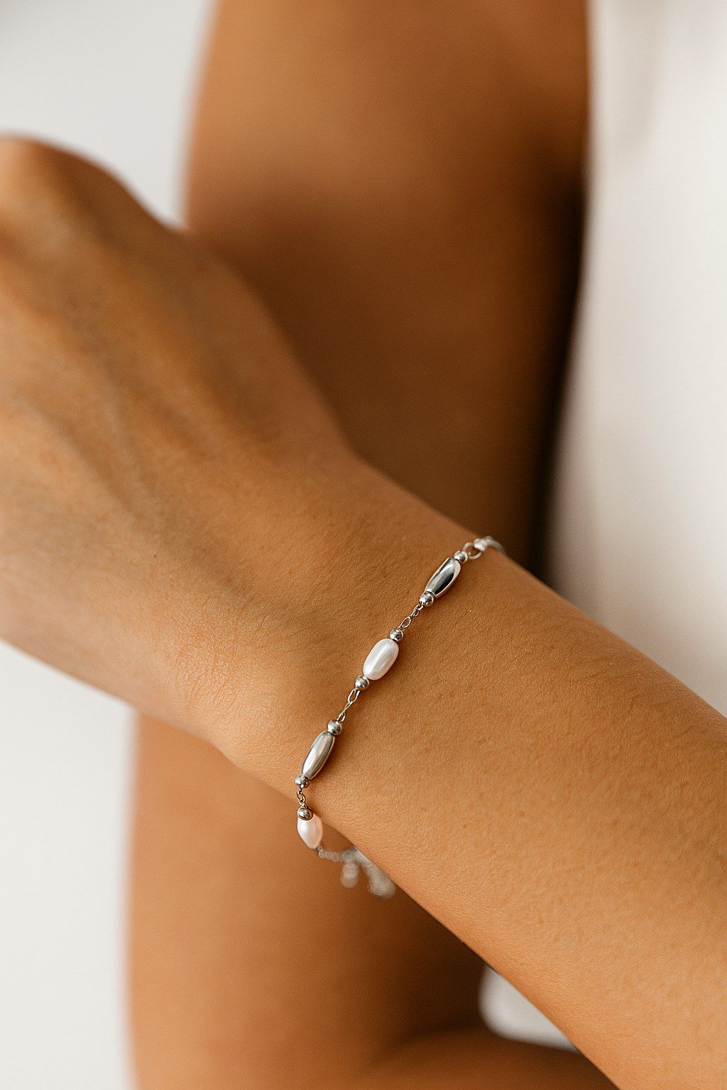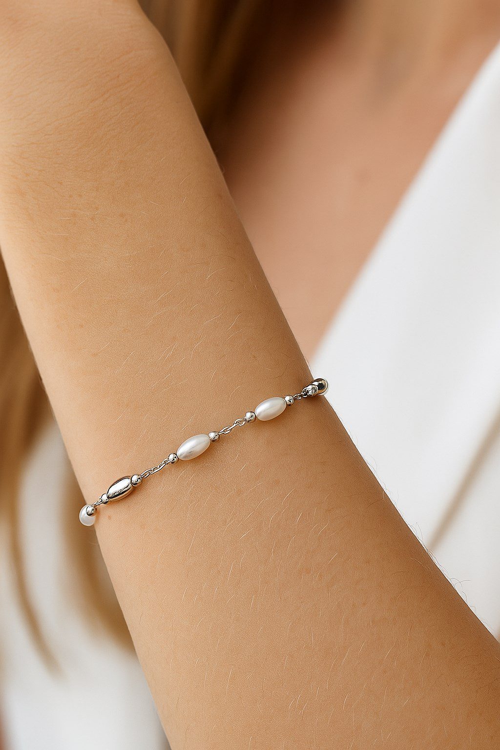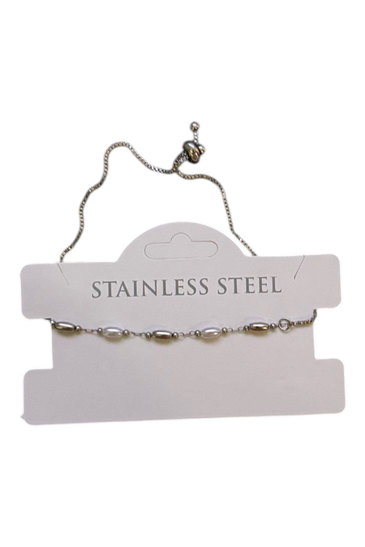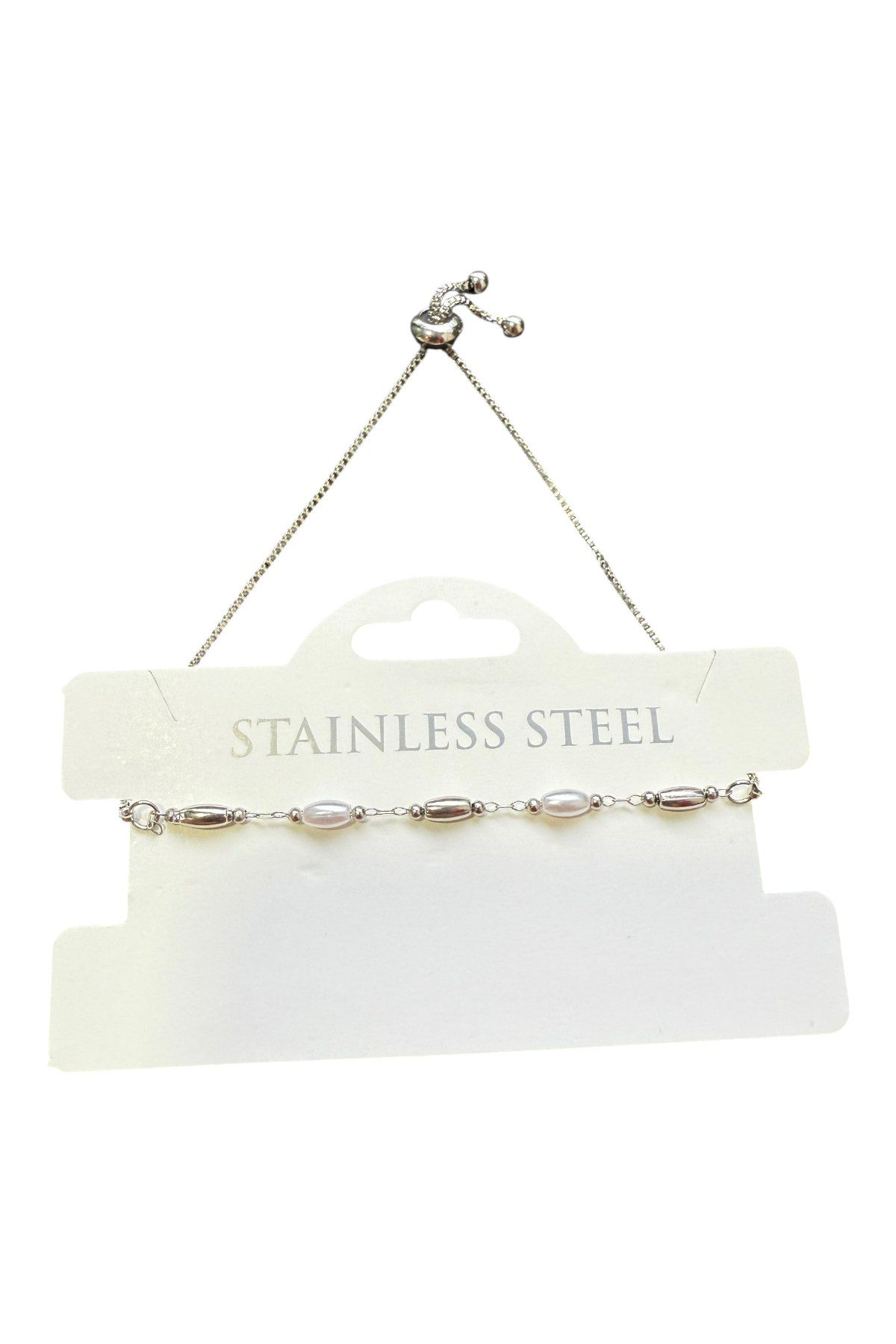 Toptan Gümüş Renk Silindir İnci Metal Asansör Çelik Bileklik – 3584