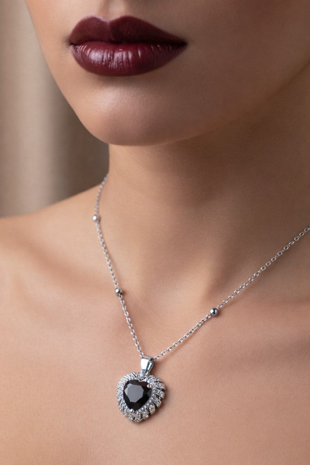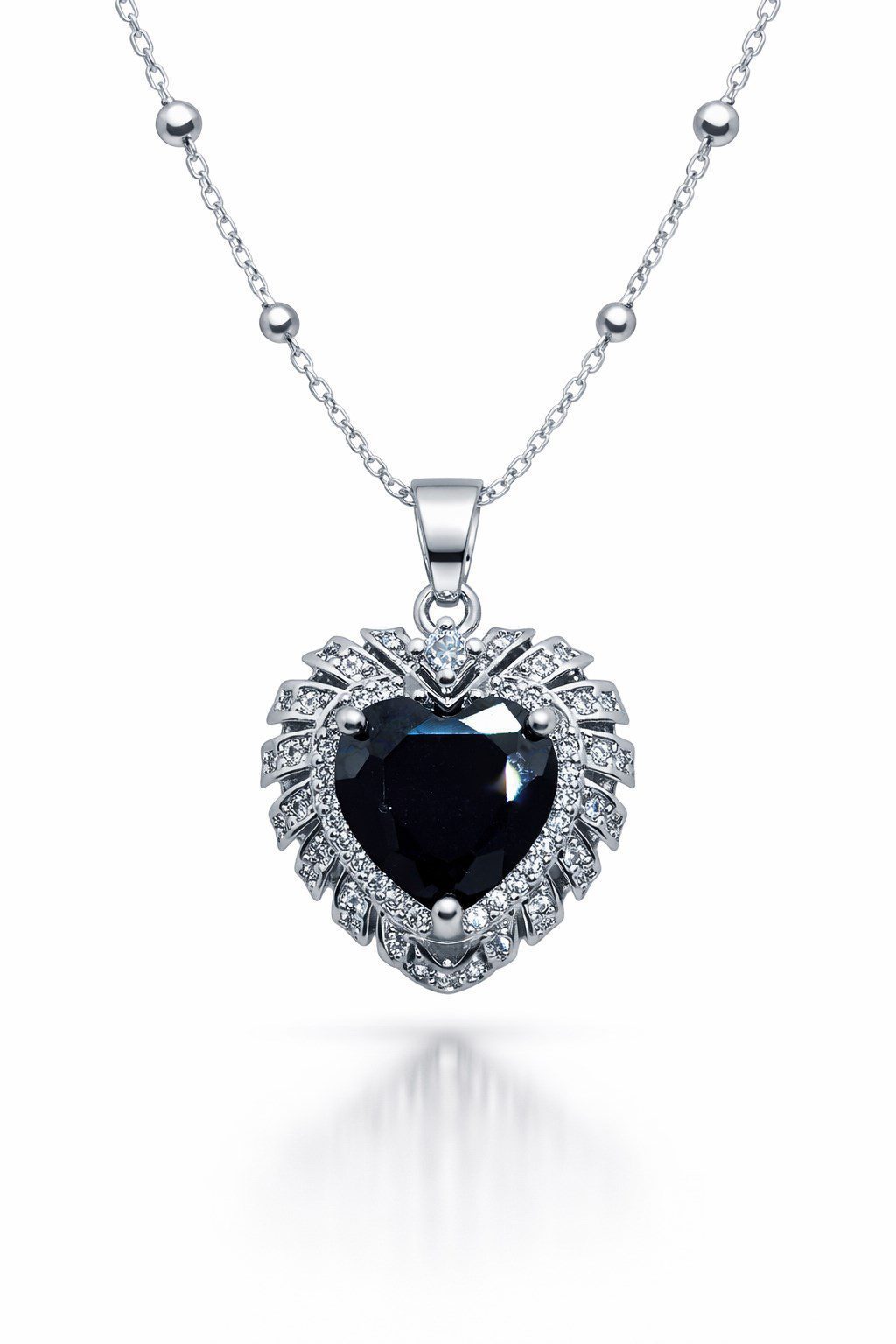 Toptan Gümüş Renk Siyah Taş Kalp Model Top Zincir Çelik Kolye- 3852