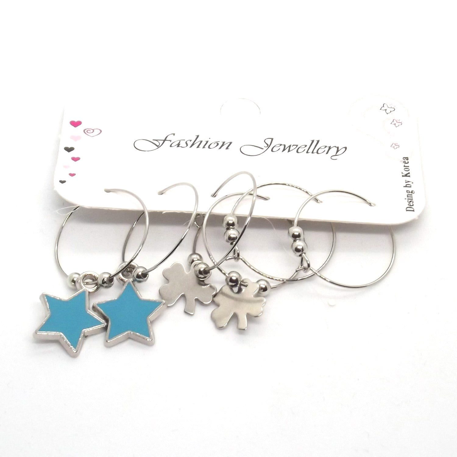 Toptan Gümüş Renk Turkuaz Mineli Yıldız Yonca Figurlu Kombin Küpe 719