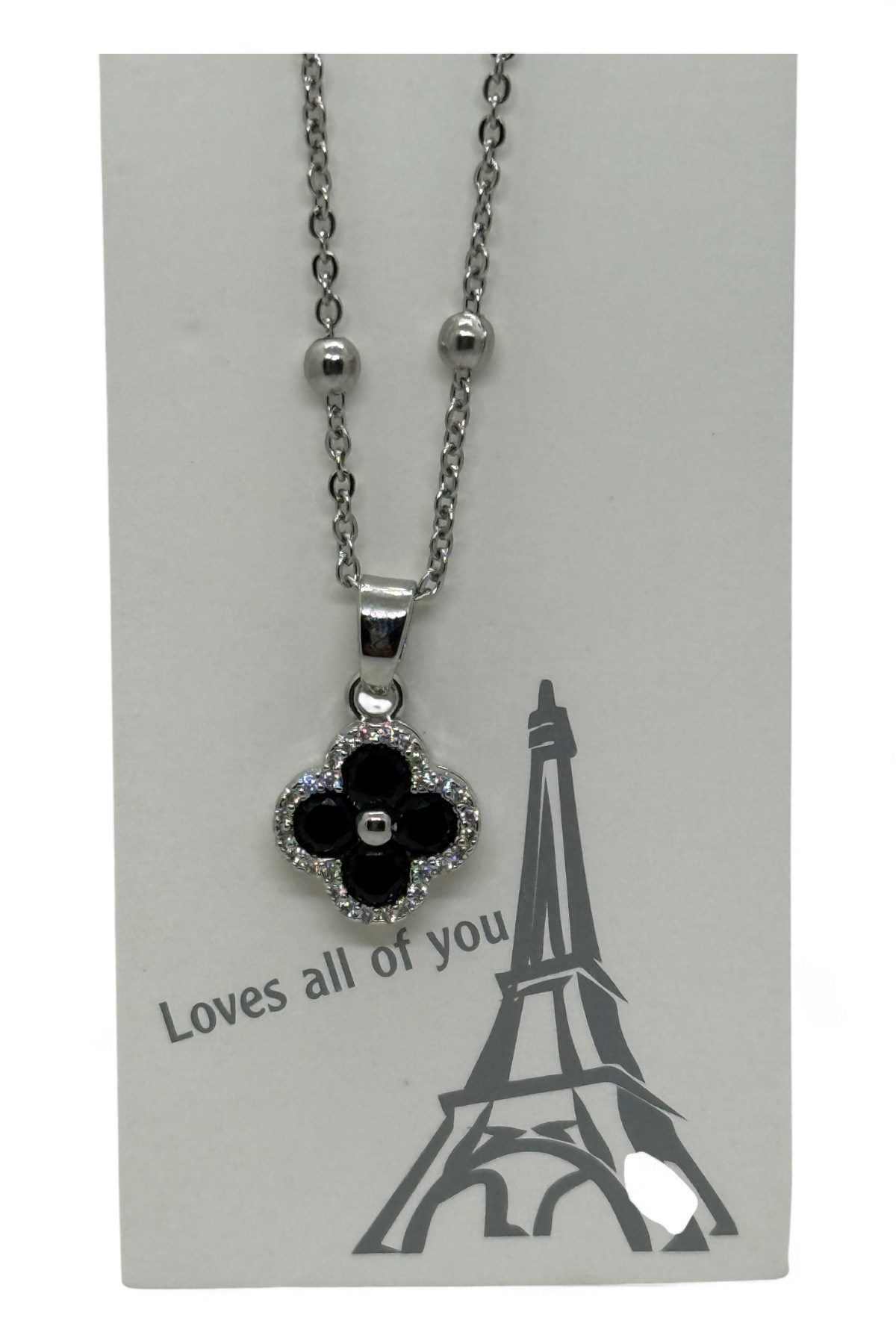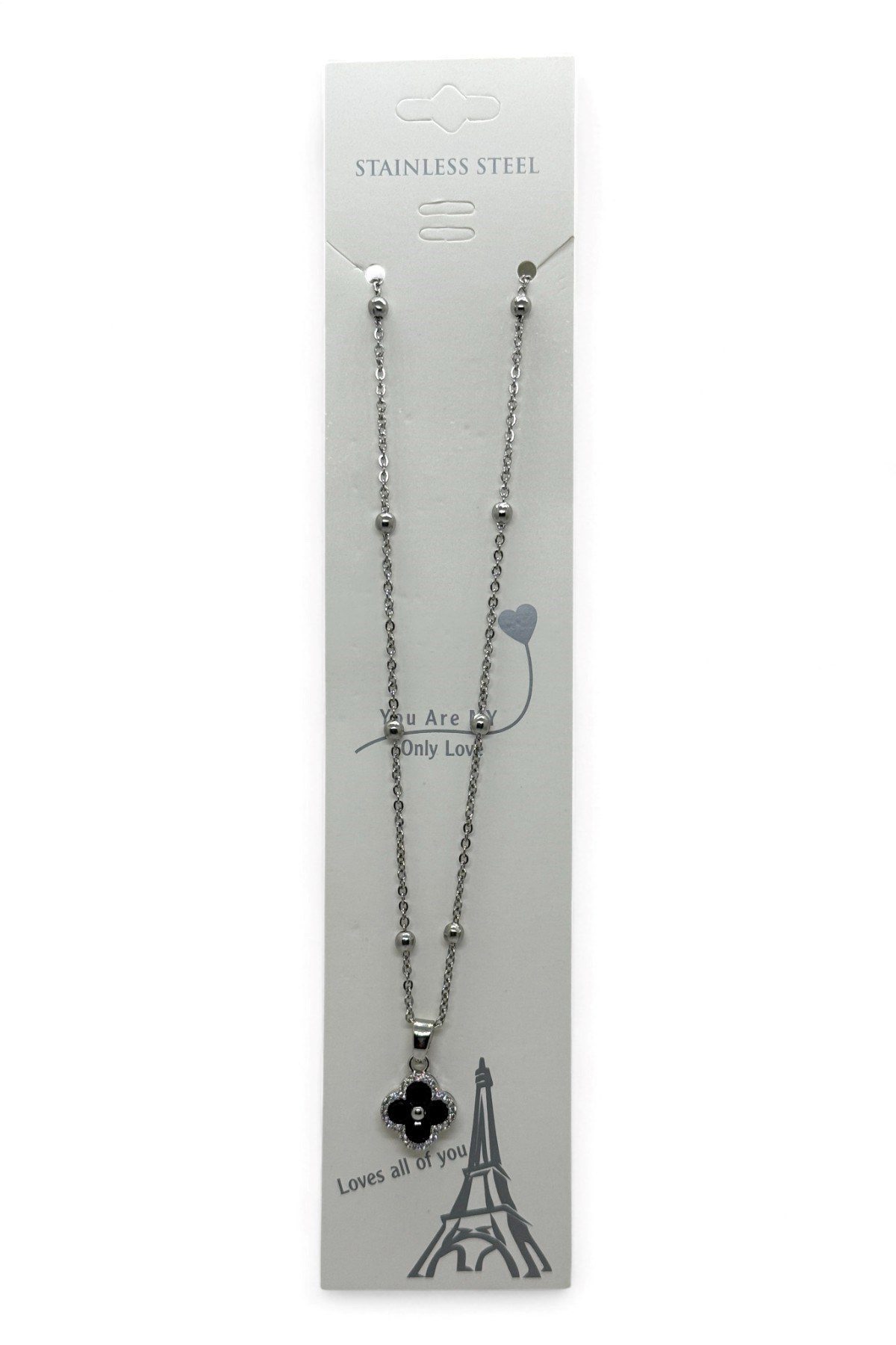 Toptan Gümüş Renk Van Cleef Yonca Siyah Taşlı Model Top Zincir Çelik Kolye – 3802