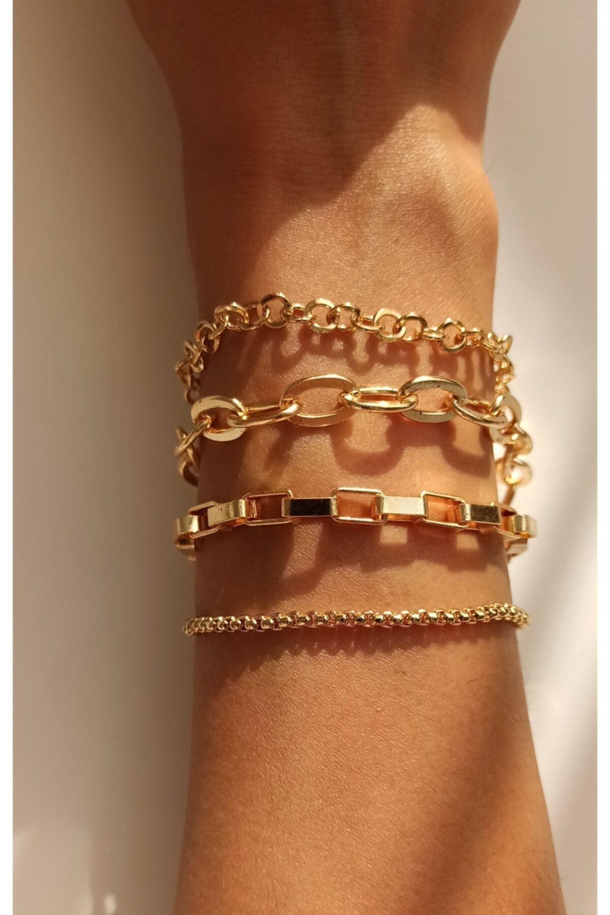 Toptan Kadın Altın Dörtlü Düz Kombin Zincir Bileklik